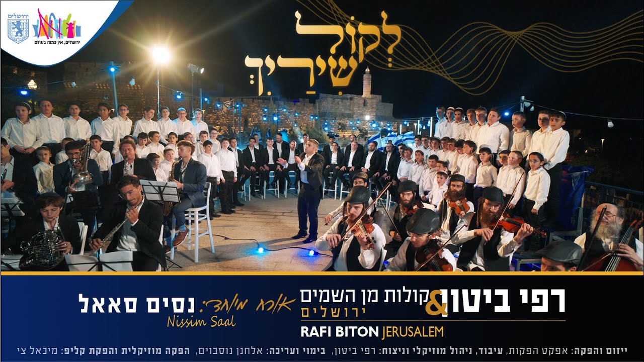 בס"ד עיריית ירושלים מגישה: 'לקול שירייך' רפי ביטון & קולות מן השמים - ירושלים, ע"ש שושנה זילברשטיין אורח: החזן נסים סאאל לערוץ של ניסים סאאל: https://youtube.com/@nissimsaal3821?si=VC56dhFqy4lyZzYF ייזום והפקה: אפקט הפקות בימוי ועריכה: אלחנן נוסבוים הפקה מוזיקלית והפקת קליפ: מיכאל צי ......... עיבוד, ניהול מוזיקלי וניצוח: רפי ביטון תיזמור סימפוני: אייל ריץ' תופים: אבי אבידני בס: אלון הלל גיטרות: אבי סינגולדה, שלמה לוי פסנתר: אביה גרינברג כינורות: כינורות זמירות גרופ כלי נשיפה: שחר לבנה הקלטות: אולפני קולות מן השמים, אולפני טנור, אולפני חנוך מנלה, אולפני בנט - יואלי צישיסנקי, אולפני שלוימי בוקשפן, מיקס ומאסטרינג: בנקו מנדיל עיצוב סאונד ועריכות שירה: חנוך מנלה ......... צוות "קולות מן השמים": מנהל הפקה - יואל ברקוביץ' מנהלת מותג ותוכן - נעמה קדוש מפיק בפועל - משה פרידמן ניהול משרד - רונית קונה ניהול מדיה - יוסף בורשטיין .......... צילום: דוד אוריאן, אלי זינגר ציוד תאורה: דוד אוריאן תאורן: דניאל סולודודה ע. תאורה: ג'וש טרכטמן ע. הפקה: דודי באואר, יהודה ב, שמעון בן חמו ליהוק וניהול נגנים: חיים ליפשיץ עיצוב וארט: דודי מילר הגברה ותאורה חכמה: שמחה פייגנבוים השכרת במות וכסאות: שר ציוד לאירועים צולם במרפסת הVIP שדרות ממילא תודות לחנה ברזילאי ולקובי מנהל השדרה ....... נגנים בקליפ: פסנתר: אביה גרינברג תופים: יאיר קרינקין גיטרה חשמלית: שלמה לוי כלי קשת: 'פידלערס' בניצוחו של הכנר מוטי ווייס אקורדיון: נחמן שרביט חליל צד וקלרינט: שוקי וינברג קרנות יער: מתיא גרינברג, דניאל וילנצ'יק חצוצרות: יובל גלס, ניתאי לוי טרומבון: איתמר גיל סקסופונים: שלמה שטאדטמאוער, דניאל סינצ'וק השכרת פסנתר כנף: שלמה ברונר ייעוץ ותודות: שלומי רשלבך שמחה פכטמן אביגיל גור אברומי פרידמן שרוליק אייזן תודה מיוחדת לראש העיר ירושלים משה ליאון לתיאום ובוקינג: רונית - 0542322974 bitonrafael@gmail.com