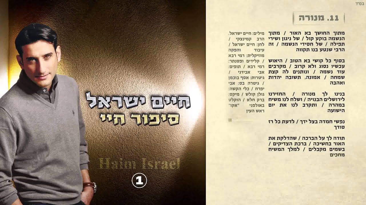 ניהול אישי: שלום ישראל - 0522490052 | a522490052@gmail.com רצועה מספר 11 - מנורה מתוך האלבום "סיפור חיי" חלק א' הצטרפו לעמוד הפייסבוק של חיים ישראל: https://www.facebook.com/HaimIsraelMusic להזמנות אירועים: שלום ישראל 052-2490052 | יחסי ציבור: אביאל יאיר נחום 0506000417 מנורה מתוך החושך בא האור מתוך הנשמה בוקע קול של ניגון ושירי תפילה של חסידי הנשמה זה הרבי שנטע בנו תקווה בסוף כל קושי בא הטוב היאוש עכשיו נסוג ולא קרוב מקרבים עוד נשמה ונותנים לה קצת שמחה אמונה, תשובה יהדות ואהבה בנינו לך מנורה החזירנו לירושלים הבנויה ושלח לנו משיח במהרה ותקרב לנו את יום הישועה נפשי חמדה בצל ידך לדעת כל רז סודך תודה לך על הברכה שהדלקת את האור בחשיכה ברכת הצדיקים בשמים מקבלים למלך המשיח מחכים מילים: חיים ישראל, הרב קמינצקי לחן: חיים ישראל עיבוד והפקה מוזיקלית: רמי רבא קלידים ופסנתר: רמי רבא תופים: אבי אבידני גיטרות: אסף בוכמן גיטרה בס: אבי יפרח כלי הקשה: גולן קולש מיקס: ברק חלא הוקלט באולפני "אקו" ראש העין