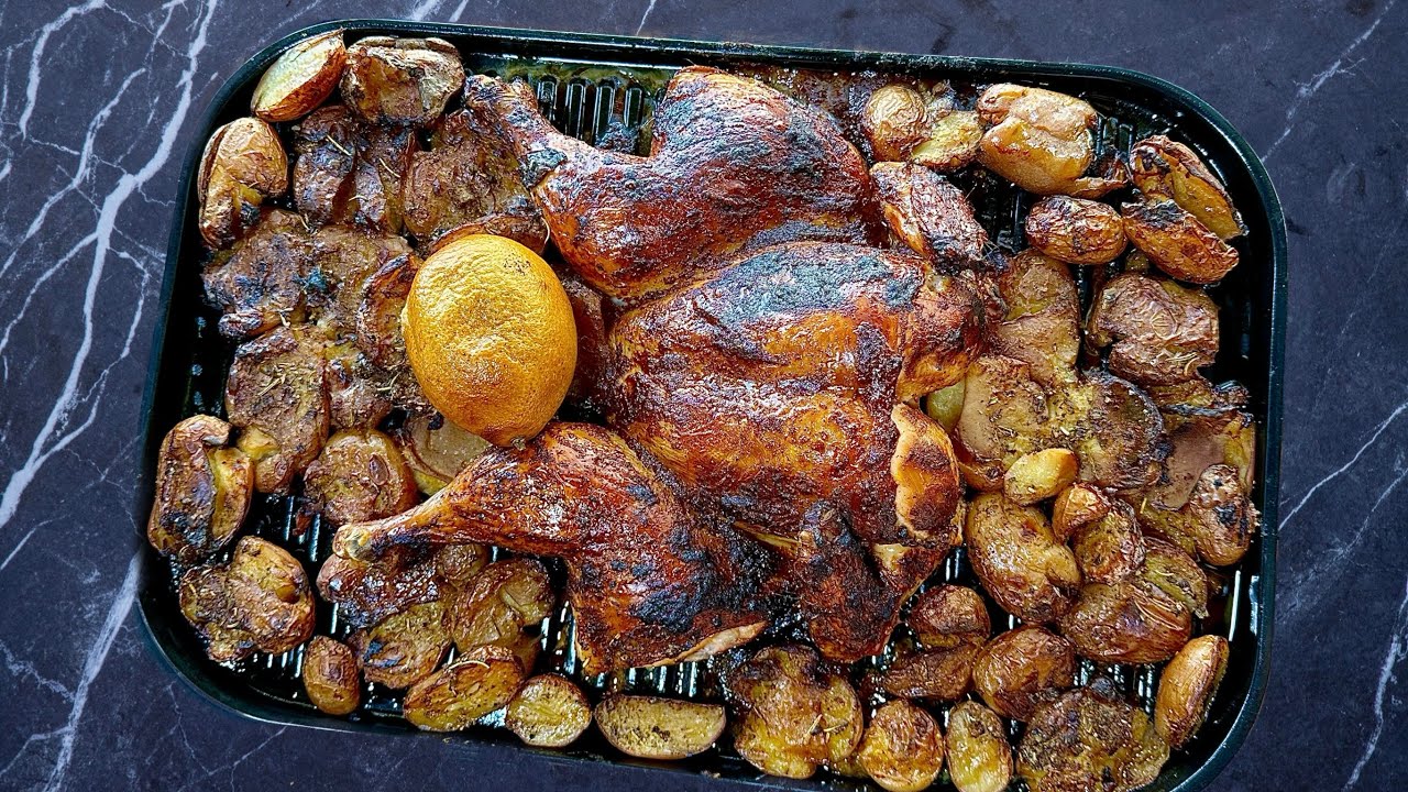 עוף שלם ותפוחי אדמה בגריל חיצוני מעשנה של הנינג׳ה