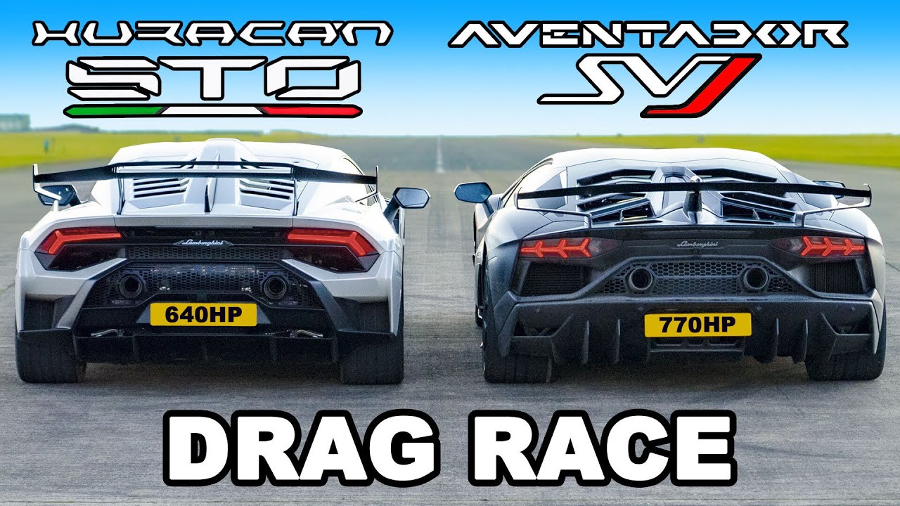 Need help buying your next car? Click the following link and my team and I will help you choose your ideal car at a fair price - from Mat Watson! https://bit.ly/Wow-Me-carwow ............................................................. Thanks to Connor for helping to organise this race: https://bit.ly/CConnor15-1202 Subscribe to Mark's channel: @MarkMcCann64 LAMBO DRAG RACE LET’S GOOOO!! We’ve got our hands on the Huracan STO going head-to-head with the Aventador SVJ to see which is the ultimate Lambo over the quarter-mile. Now we’re sure we don’t need to tell you, but the stats on both of these cars are absolutely WILD! Starting with the ‘less powerful’ car, we have the Huracan STO. It’s powered by a 5.2-litre NA V10 that can put down 640hp & 565Nm of torque. It’s super light as well, weighing just 1,339kg! And then we have the SVJ. It’s packing a 6.5-litre V12 under the bonnet that can put down an awesome 770hp and 690Nm (or is it 720Nm? Check the pinned comment!) of torque. It’s a bit heavier than the STO, though, tipping the scales at 1,525kg. Will it be a walkover for the SVJ? There’s only one way to find out - LET’S RACE! ............................................................. Instagram – http://www.instagram.com/carwow Tiktok - https://www.tiktok.com/@carwow Facebook – http://www.facebook.com/carwowuk Twitter – http://www.twitter.com/carwowuk Sign Up to our Newsletter – http://bit.ly/carwow-Newsletter Awkward haggling is a thing of the past with carwow. Choose your perfect car with our configurator tool and let the country’s best dealers compete over you. Compare the five best offers by price, location and dealer ratings and choose the one that’s right for you – no hassle, no haggling, just a great deal. Oder auch in Deutschland Geld beim Autokauf sparen – http://bit.ly/carwow-DE Visita nuestra página web para saber cuánto te puedes ahorrar en tu nuevo coche – http://bit.ly/carwow-ES
