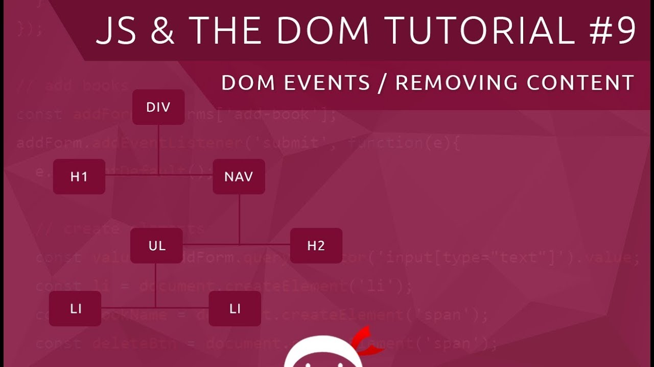 Hey gang, in this JavaScript DOM tutorial I'll explain how we can attach event listeners to elements on a page, which can react to DOM events such as click, submit etc. ----- COURSE LINKS: + Atom editor - https://atom.io/a + GitHub Repo - https://github.com/iamshaunjp/JavaScript-DOM-Tutorial --------------------------------------------------------------------------------------------- Other tutorials: ----- JAVASCRIPT FOR BEGINNERS: https://www.youtube.com/playlist?list=PL4cUxeGkcC9i9Ae2D9Ee1RvylH38dKuET ----- CSS FOR BEGINNERS: https://www.youtube.com/playlist?list=PL4cUxeGkcC9gQeDH6xYhmO-db2mhoTSrT ----- NODE.JS TUTORIALS https://www.youtube.com/playlist?list=PL4cUxeGkcC9gcy9lrvMJ75z9maRw4byYp ----- SUBSCRIBE TO CHANNEL - https://www.youtube.com/channel/UCW5YeuERMmlnqo4oq8vwUpg?sub_confirmation=1 ============== The Net Ninja ===================== For more front-end development tutorials & to black-belt your coding skills, head over to - https://www.youtube.com/channel/UCW5YeuERMmlnqo4oq8vwUpg or http://thenetninja.co.uk ================== Social Links ================== Twitter - @TheNetNinja - https://twitter.com/thenetninjauk