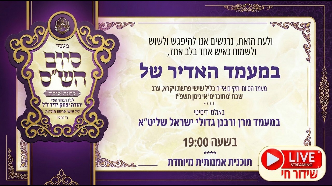📖 מעמד סיום הש״ס במעמד מרנן ורבנן גדולי ישראל שליט״א 🎶 בליווי שירה וזמרה, עם מיטב בעלי המנגנים לכבודה של תורה ✨ תוכנית אומנותית מיוחדת ומרגשת 🕖 השידור יחל היום בשעה 19:00 בערב