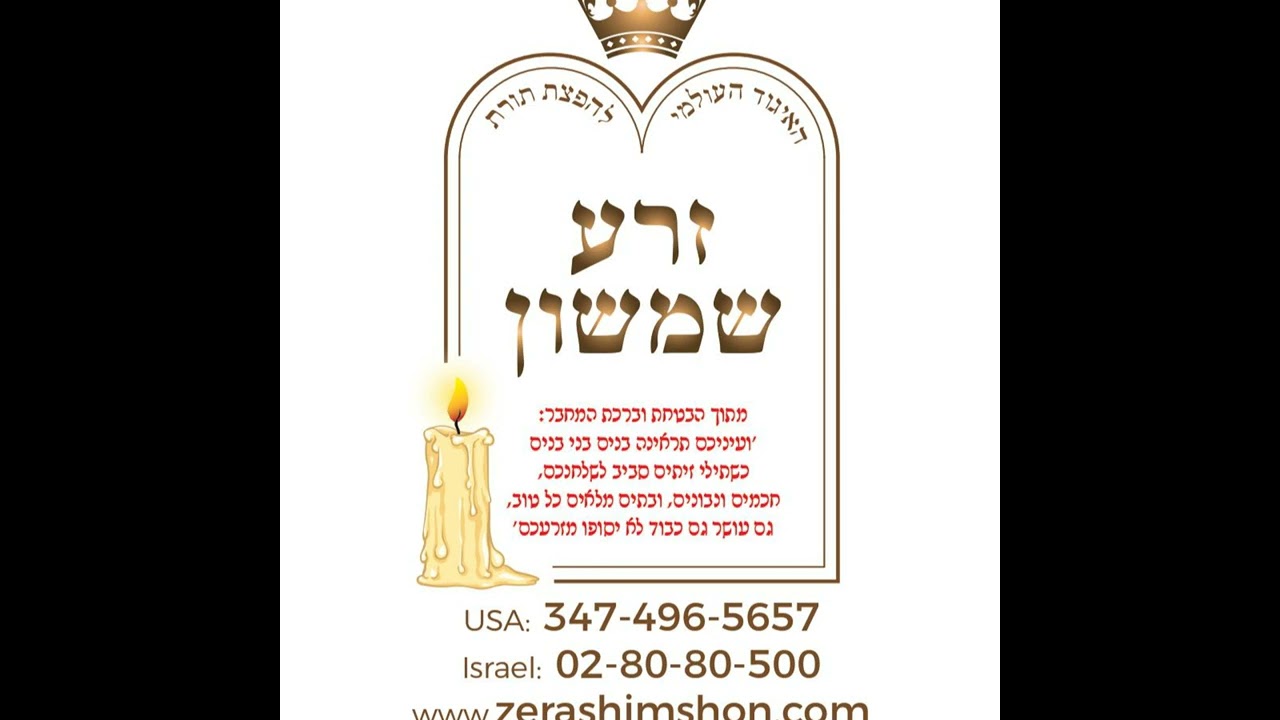 Presented by the World Organization for the Distribution of the Torah of Zera Shimshon. The study of the book Zera Shimshon is most conducive to receiving blessings and salvation, as its author assured: “And with your eyes you will see children, and the children of your children, like olive trees around your tables, wise and knowledgeable; and houses full of everything good; both wealth and honor will not cease from your offspring”. The great Gaon, giant in Torah, Rabbi Chaim Kanievski, zt’l, testifies that it is proven that the study of this book is mystically conducive to obtaining salvation and blessing. Thousands of people testify about the salvation and wonders they experienced because of their study. Do not leave it for later. Do not miss it. This is the opportunity to deserve the salvation and blessing that you and your families need. For more details about the books, for assistance or for donations in fulfillment of the request of the sacred author to have the merit of the blessing, you can contact us by the following means: Email: zera277@gmail.com Website: www.zerashimshon.com Phones: In Israel: Harav Israel Zilberberg: + 972-2-80-80-500 In the United States: Harav Menachem Binyamin Fashkas: + 1-347-496-5657 https://play.google.com/store/apps/details?id=com.kesherhk.zerashimshon מוגש על ידי 'האיגוד העולמי להפצת תורת זרע שמשון'. הלימוד בספר זרע שמשון מסוגל ביותר לברכות ולישועות וכהבטחת המחבר 'ועיניכם תראינה בנים ובני בנים כשתילי זיתים סביב לשולחנכם חכמים ונבונים ובתים מלאים כל טוב גם עושר גם כבוד לא יסופו מזרעכם'. הגאון הגדול שר התורה רבי חיים קנייבסקי זצ׳ל, העיד שהלימוד בספר סגולה בדוקה לישועה וברכה. אלפים מעידים על ישועות ונפלאות. אל תחמיצו. אל תפספסו. זו ההזדמנות שלכם לזכות לישועה ולברכה עבורכם ועבור משפחתכם. ליתר פרטים בענין הספרים, לסיוע ולתרומות לקיום בקשת המחבר הקדוש לזכות ולברכה פנו לאתר: zerashimshon.com או במייל: zera277@gmail.com או בטלפון: ארץ ישראל הרב ישראל זילברברג 02-80-80-500 ארה"ב הרב מנחם בנימין פאשקעס 347-496-5657 https://play.google.com/store/apps/details?id=com.kesherhk.zerashimshon