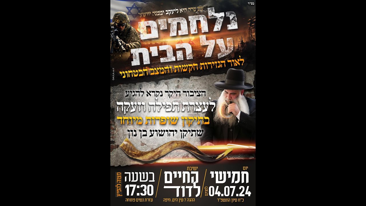 צפייה ישירה ב-YouTubeהיום בשעה 17:30 נפגשים כולם בישיבת החיים לדוד רחוב ההגה 7 עין הים חיפה לעצרת תפילה וזעקה בגלל המצב