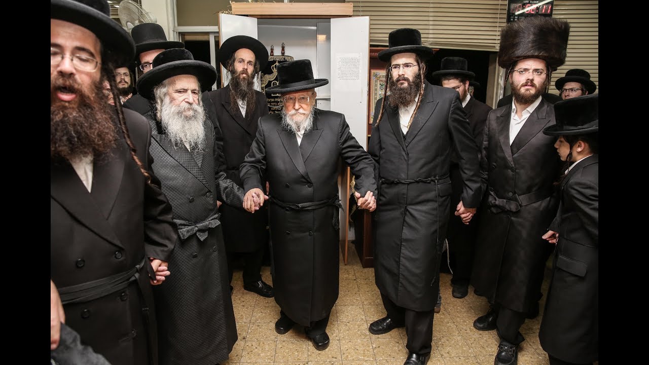 האדמו''ר מביאלא רוקד עם הרב אלעזר מרדכי קעניג שליט''א בהכנסת ספר תורה לבית מדרש ביאלא בעיר צפת ,סיון תשע''ח