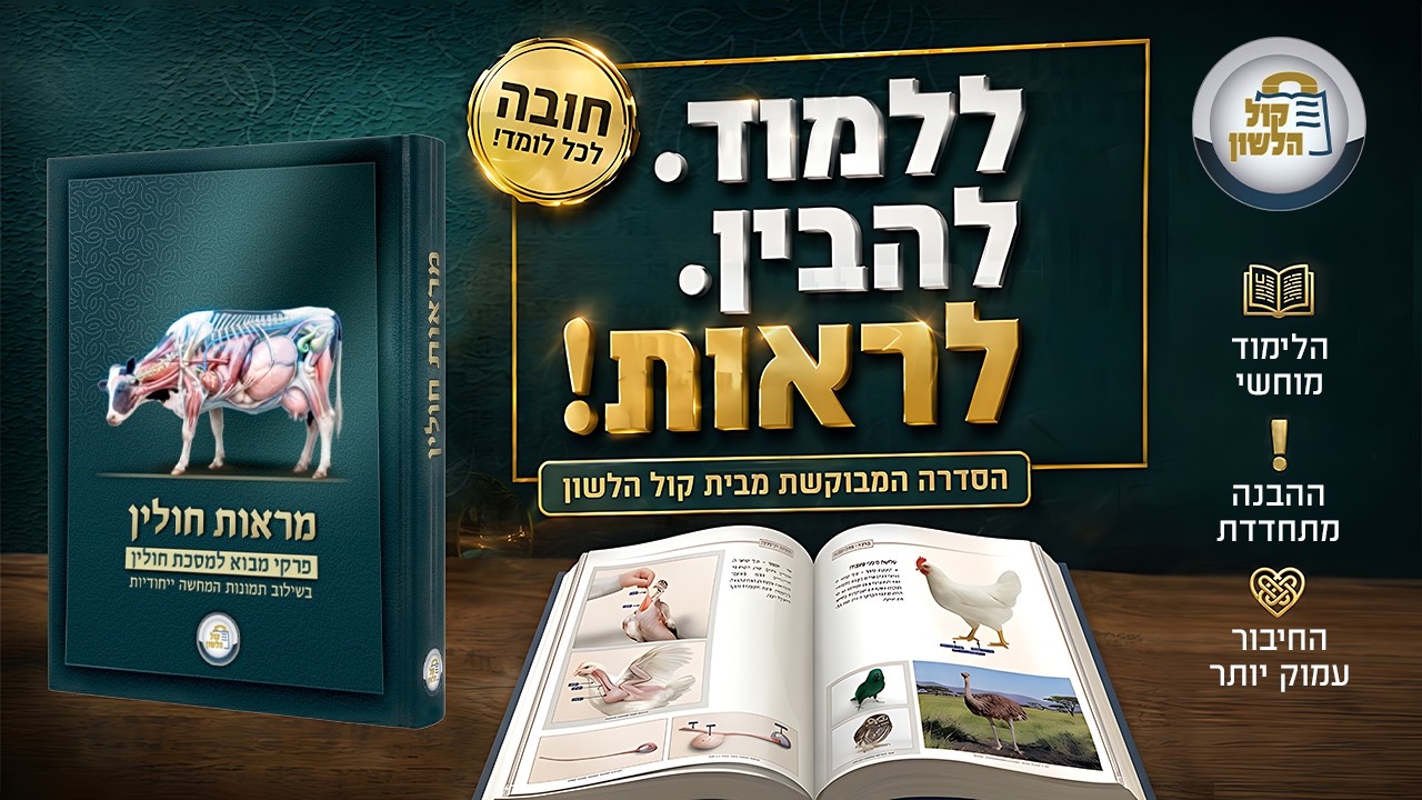 קשה להבין סוגיות מורכבות עד שלא רואים אותן. ספר "מראות חולין" החדש מבית ארגון 'קול הלשון' משנה לחלוטין את חווית לימוד הגמרא. הספר כולל למעלה מ-500 תמונות איכותיות, איורים מדויקים והמחשות תלת-ממד של חלקי הבהמה, החיות והעופות - החל מגיד הנשה ועד לסימני טהרה וטרפות.