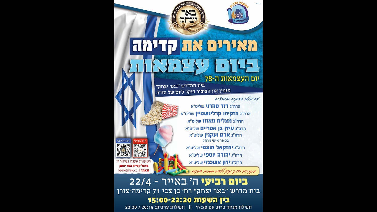 יום שכולו תורה בבית המדרש באר יצחק קדימה - לכבודו של השם יתברך עם הרבנים הרה"ג דוד טהרני הרה"ג חזקיהו קרלינשטיין , הרה"ג מצליח מאזוז הרה"ג עידן בן אפריים הרה"ג אדם ועקנין הרה"ג יחזקאל מוצפי הרה"ג יהודה יוספי הרה"ג ירון אשכנזי