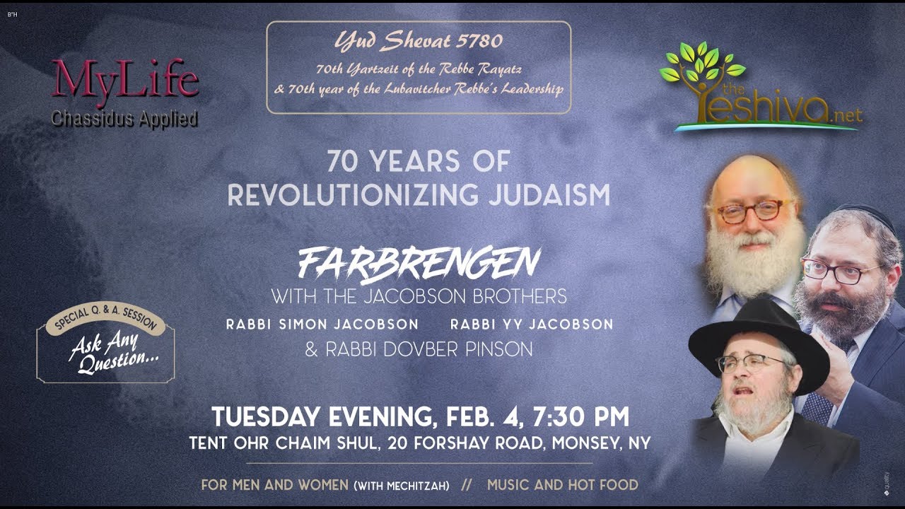 Dedicated to the memory of my dear father, Reb Ezriel ben Reb Yaakov Salomon, a visionary educator, by Chani and Sam Salomon (Manchester) Second segment of the Farbrengen of Yud Shevat 5780 "70 Years of Revolutionizing Judaism," with Rabbis Simon & YY Jacobson & DovBer Pinson, questions and answers. This Farbrengen took place Tuesday evening, Yud Shevat, 5780, February 4, 2020, at the Ohr Chaim Shul, in Monsey, NY, in tribute to the 70th yartzeit of the sixth Lubavitcher Rebbe, Rabbi Yosef Yitzchak Schneerson, and 70 years of the Lubavitcher Rebbe's leadership. To watch more classes & to read Rabbi YY's articles visit: https://www.theyeshiva.net Follow Rabbi YY Jacobson: Youtube: https://www.youtube.com/c/RabbiYYJacobson Facebook: https://www.facebook.com/TheYeshiva Instagram: https://www.instagram.com/yyjacobson Twitter: https://twitter.com/YYJacobson Linkedin: https://www.linkedin.com/in/yyjacobson/ Telegram: https://t.me/RabbiYY #yudshevat #farbrengen #chabad