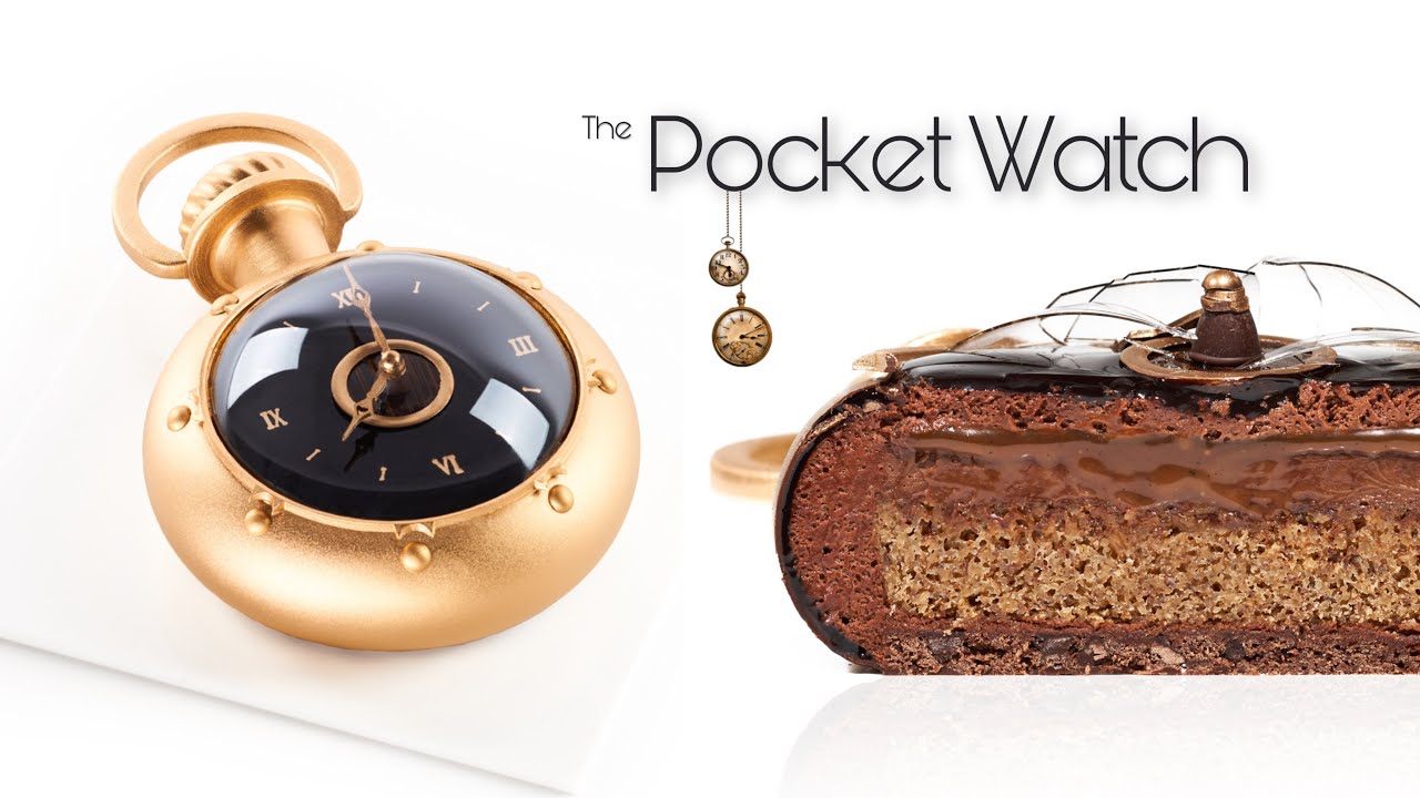 The pocket watch! This creation is very special as it was conceived for the grand finale episode of MasterChef, Australia. It is composed of a double chocolate chip cookie base, a moist hazelnut coffee financier sponge, a coffee cremeux, a soft coffee vanilla caramel and a rich chocolate mousse. The whole entremet is coated in a dark chocolate mirror glaze! All the decorative elements are crafted out of dark chocolate and it’s finished with my famous sugar dome! This was definitely a difficult challenge for the two finalist!