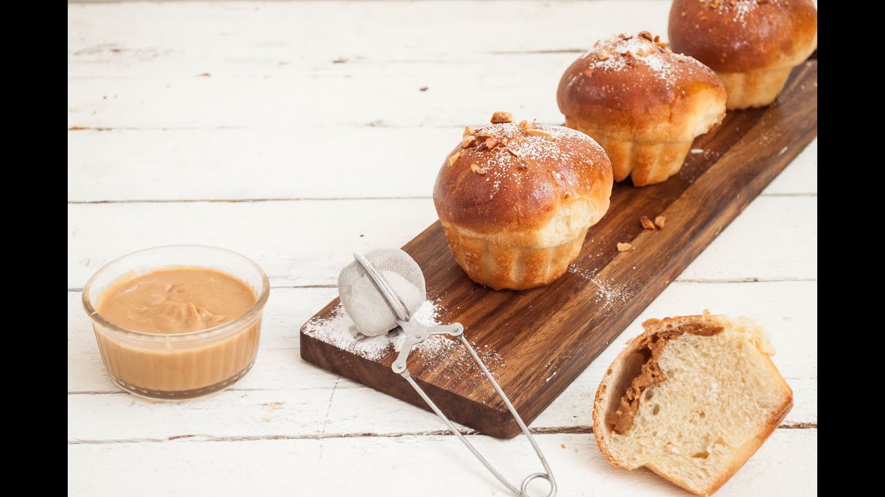 חומרי הגלם: 500 גרם קמח לחם 100 גרם מים קרים 150 גרם חלב קר 120 גרם ביצים קרות 75 גרם סוכר 16 גרם שמרים טריים 10 גרם מלח 120 גרם חמאה קרה חתוכה לקוביות למלית: חמאת בוטנים לציפוי: ביצה טרופה בוטנים מלוחים קצוצים גס לסירופ סוכר: 100 גרם מים 130 גרם סוכר אופן ההכנה: בקערת המיקסר שמים מים, חלב, ביצים, קמח, סוכר ושמרים ולשים במהירות נמוכה כ 4 דקות, ממשיכים ללוש במהירות גבוהה כ 4 דקות נוספות. מוסיפים את המלח ולאחר 2 דקות מתחילים להוסיף את החמאה בשלבים עד אשר היא נטמעת לחלוטין בבצק (אמור לקחת כ 4-5 דקות). מסיימים את הלישה על גבי שולחן עבודה מקומח, מניחים את הבצק בעקרת המיקסר, מכסים ומעבירים למקרר למנוחה של לפחות 6 שעות (אפשר לשמור עד יומיים במקרר). מחלקים את הבצק למשקל הרצוי (80 גרם), מחביאים בכל כדור בצק חצי כפית של חמאת בוטנים, סוגרים היטב את כדור הבצק ומניחים בתבנית הסיליקון, מתפיחים כשעה ורבע. מברישים את הבריוש בביצה טרופה, מפזרים בוטנים מלוחים ואופים ב- 170 מעלות כ-15 דקות. בינתיים מבשלים את המים והסוכר עד להסמכה קלה של הסירופ (כ- 5 דק לאחר רתיחה). בסיום האפייה מברישים בסירופ סוכר קר ומגישים. ערוץ האוכל YES 28, HOT 38