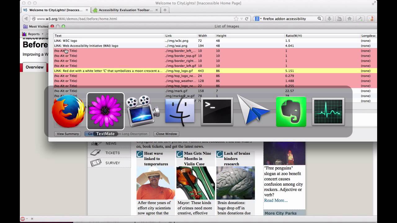 בעקבות התקנות החדשות שנכנסו לתוקף, כל אתר הפונה לקהל הישראלי חייב להיות נגיש לאנשים בעלי מוגבלויות לפי הנחיות W3C כמפורט במסמך: http://www.w3.org/TR/WCAG20/ בסרטון אני מדגים כיצד להשתמש בתוסף לפיירפוקס כדי לבדוק בעיות נגישות נפוצות ולתקן אותן. לינק לתוסף: https://addons.mozilla.org/he/firefox/addon/accessibility-evaluation-toolb/ לינק לעמוד הדוגמא: http://www.w3.org/WAI/demos/bad/before/annotated/home.html