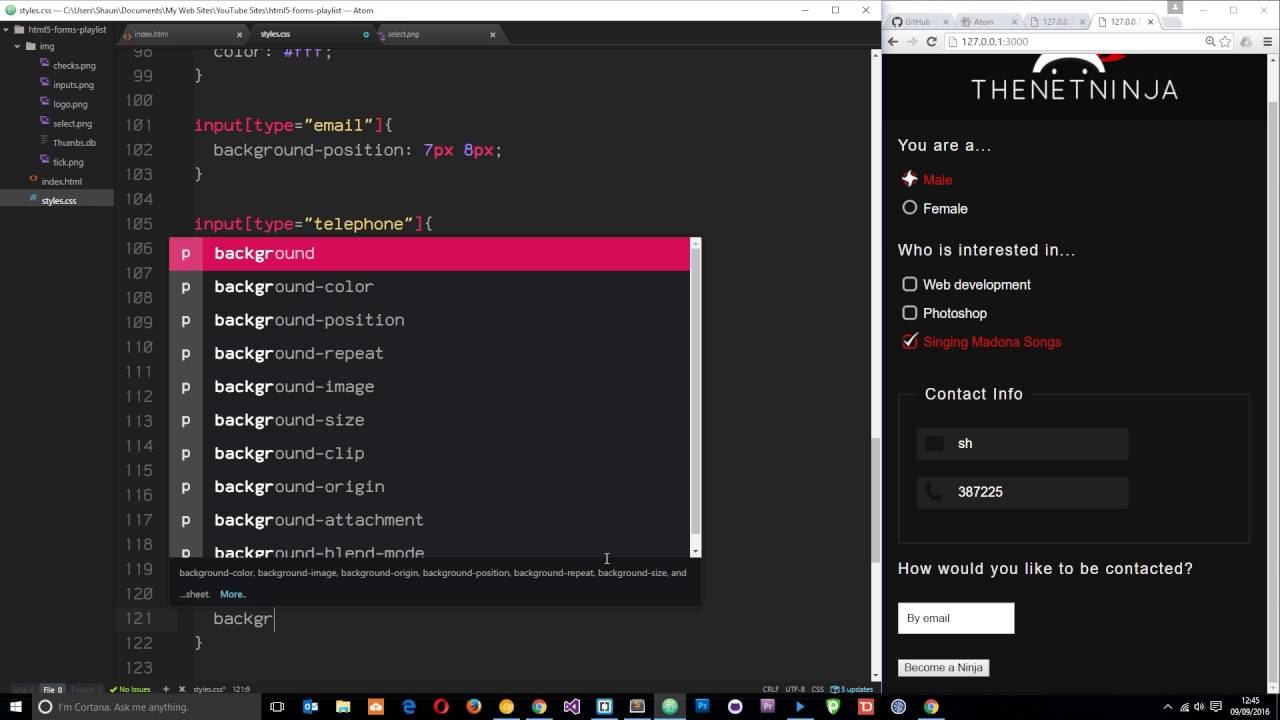 ----- COURSE LINKS: + Repo - https://github.com/iamshaunjp/styling-html5-forms-playlist + Atom editor - https://atom.io/ CSS Playlist - https://www.youtube.com/playlist?list=PL4cUxeGkcC9gQeDH6xYhmO-db2mhoTSrT HTML Playlist - https://www.youtube.com/playlist?list=PL4cUxeGkcC9ibZ2TSBaGGNrgh4ZgYE6Cc --------------------------------------------------------------------------------------------- You can find more front-end development tutorials on CSS, HTML, JavaScript, jQuery, WordPress & more on the channel homepage... SUBSCRIBE TO CHANNEL - https://www.youtube.com/channel/UCW5YeuERMmlnqo4oq8vwUpg?sub_confirmation=1 ========== PSD to WordPress Playlist ========== https://www.youtube.com/playlist?list=PL4cUxeGkcC9gnow7e45LQFkNVxwQ5BH-W ============ Node.js for Beginners Playlist ============= https://www.youtube.com/playlist?list=PL4cUxeGkcC9gcy9lrvMJ75z9maRw4byYp ============== The Net Ninja ===================== For more front-end development tutorials & to black-belt your coding skills, head over to - https://www.youtube.com/channel/UCW5YeuERMmlnqo4oq8vwUpg or http://thenetninja.co.uk ================== Social Links ================== Twitter - @TheNetNinja - https://twitter.com/thenetninjauk