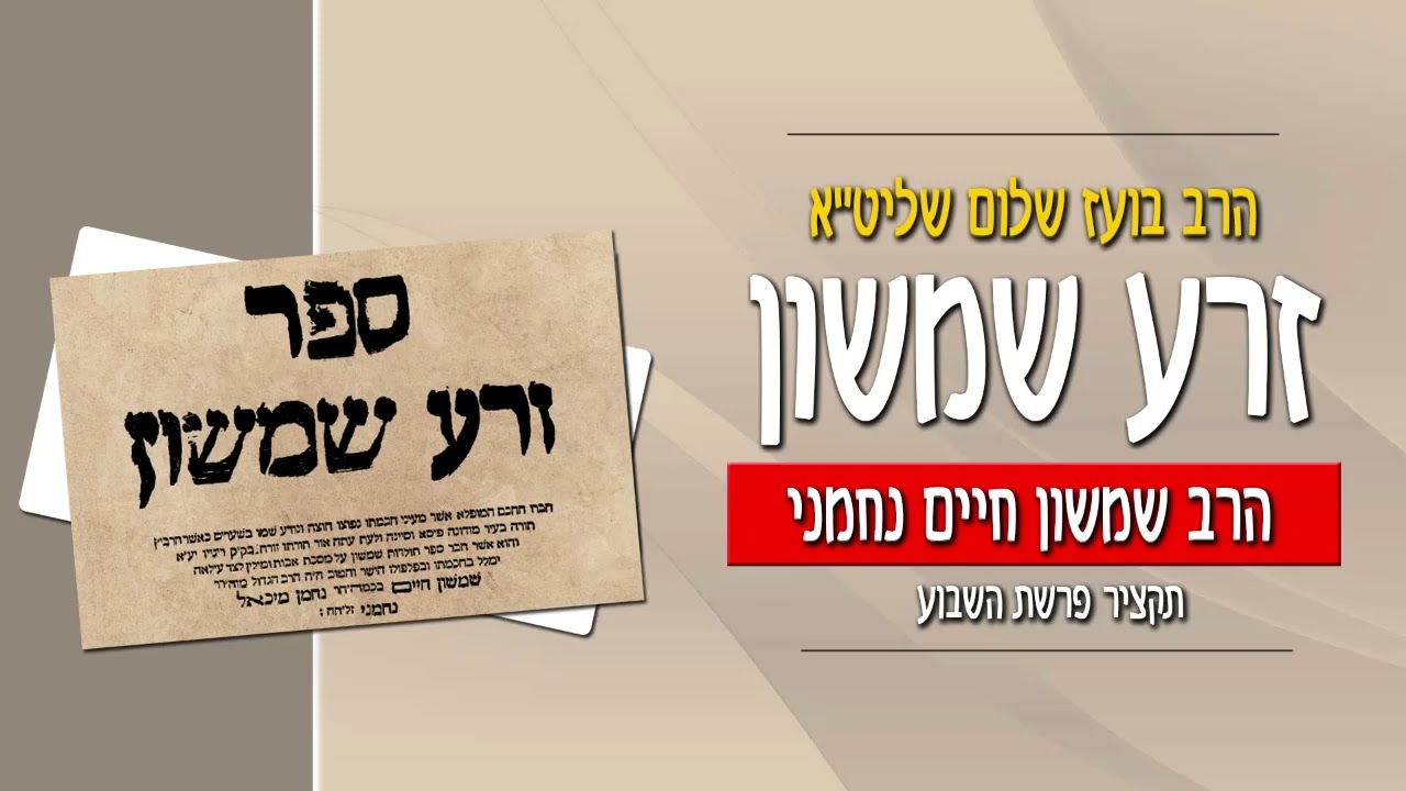 לכל המאמרים בפרשה - לחץ כאן - https://taamu.co.il/%d7%96%d7%a8%d7%a2-%d7%a9%d7%9e%d7%a9%d7%95%d7%9f-%d7%a4%d7%a8%d7%a9%d7%aa-%d7%93%d7%91%d7%a8%d7%99%d7%9d/ ------------------------------------------------------------------------------------------------------------------------ מעלת הספר זרע שמשון - והבטחת רבי שמשון חיים נחמני "ואקוד ואשתחוה לה' ואודה לו במאוד מאד בכל מדה ומדה, כי בחסדיו הרבים, אף בשעת כעסו - שלקח ממני בני יחידי בכורי ידיד נפשי, זכר לי את הרחמים כי שת לי זרע אחר, והגיעני לכלל זורעי על כל מים, אין מים אלא תורה, זרע השלום זרע אמת, ולכן קראתי ספר זה בשם זרע שמשון." "ומעתה אחי ורעי אוהבי ומיודעי זרע ברוכי ה', הא לכם זרע, אור זרוע לצדיקים כמותכם, במטותא בעינא מינייכו, זרעו לכם לצדקה וקצרו לפי חסד של אמת, וכי מרובה מדת תשלומי חן וחסד ושלמא רבא מן שמיא, ועיניכם תראינה בנים בני בנים כשתילי זיתים סביב לשלחנכם חכמים ונבונים, ובתים מלאים כל טוב, גם עושר גם כבוד לא יסופו מזרעכם'" הרב בועז שלום שליט"א הוציא בשנים האחרונות אלפי שיעורי תורה במגוון נושאים. שיעורים מעמיקים בתנ"ך, משנה, דף היומי, מחשבה, מוסר, הלכה, אגדה, עין יעקב, אור החיים, חומש עם רש"י, כלי יקר, דרשות על פרשת שבוע, ועוד. הרב מכהן כיו"ר ארגון 'טעמו וראו', וראש מדרשת 'בית אליהו' ברחוב דב גרונר 11 בבני ברק. במשך שנים עסק הרב במסירת הרצאות ובקירוב רחוקים בארגון 'ערכים' ובערוץ 'הידברות' במגוון נושאים. כמו כן מוסר הרב שיעורים קבועים במדרשת 'פסגות' שברחוב בן ציון גליס 37 אזוה"ת סגולה בפ"ת. הרב בועז שלום חיבר שני ספרים 'משנת החלומות' ו'משנת הגלגולים'. לרב בועז שלום אתר אינטרנט בשם "טעמו וראו" שם תוכלו למצוא את כל שיעוריו בכתובת https://taamu.co.il השיעורים ניתנים לשמיעה ואף להורדה בחינם. באתר ניתן אף להעיר או לשאול על השיעורים ולקבל את תגובת הרב. זכות הלימוד לעילוי נשמת אברהם בן ימנה ויעקב ויחיאל בן ימנה ויעקב ומזל בת אסתר