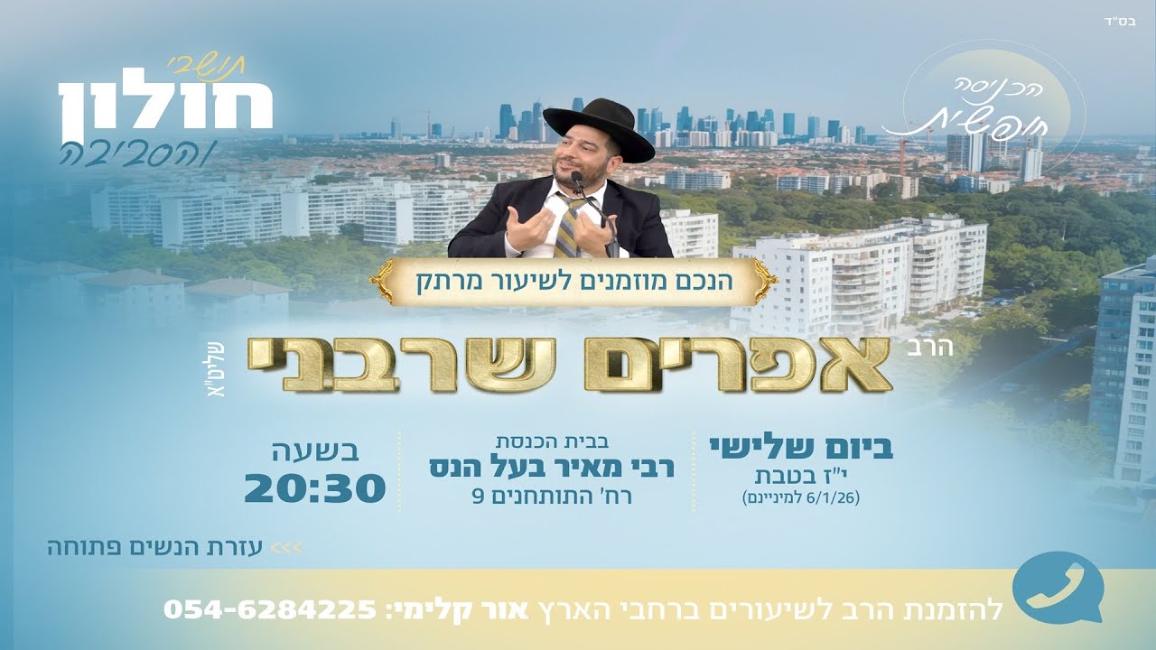 שיעורו של הרב אפרים שרבני שליט"א מתקיים מידי יום ראשון בשעה 20:15 במרכז רוחני "מחנה אפרים" רחוב אלמוג 2, שכונת גילה ירושלים. להזמנת הרב לשיעורים בכל הארץ : 054-6284225- אור קלימי