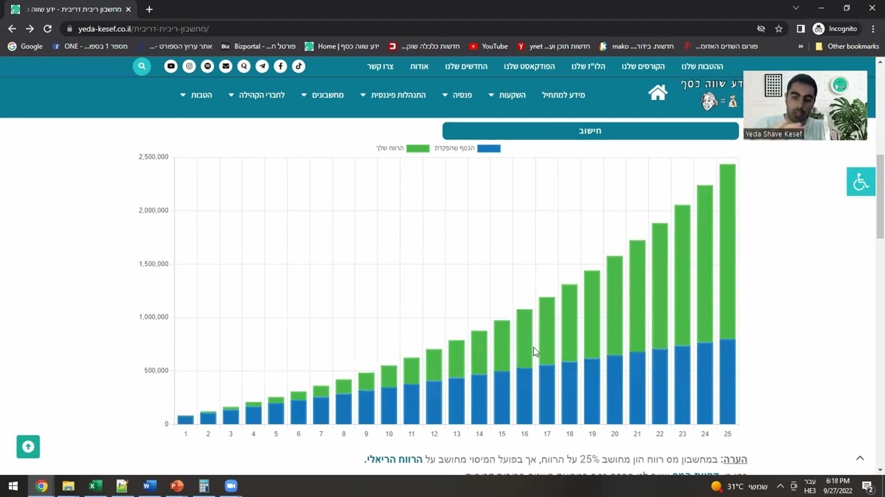 מחשבון ריבית דריבית | איך לחשב ריבית דריבית | מה זה ריבית דריבית למחשבון ריבית דריבית שלנו באתר: https://yeda-kesef.co.il/מחשבון-ריבית-דריבית/ קוד קופון הנחה על הספר "המדריך למשקיע המתחיל" לחברי הקהילה שלנו YEDA. מי שרוכש עם הקוד קופון מקבל גם סדרת סרטונים ותובנות של בר ושל שי על הספר (ישלח כשבועיים לאחר הרכישה). זה הקישור: https://bit.ly/YedaBogel לקורס שוק ההון של הקהילה: https://bit.ly/Evyakurse קישור לקבוצת שוק ההון שלנו בWHATSSPP: https://did.li/Yedastocks מהי ריבית דריבית? ריבית דריבית היא הריבית על החיסכון המחושבת הן על הקרן הראשונית והן על הריבית המצטברת מתקופות קודמות. "ריבית על ריבית", או כוחה של ריבית דריבית, מאמינים שמקורו באיטליה של המאה ה-17. זה יגרום לסכום לגדול מהר יותר מהריבית הפשוטה, שמחושבת רק על סכום הקרן. תרכובות מכפילות כסף בקצב מואץ וככל שמספר תקופות ההרכבה גדול יותר, הריבית דריבית תהיה גדולה יותר. ריבית דריבית היא ריבית המחושבת על הקרן הראשונית, הכוללת גם את כל הריבית שנצברה מתקופות קודמות. יצירת "ריבית על ריבית" ידועה ככוחה של ריבית דריבית. ניתן להצמיד ריבית בכל לוח תדירות נתון, מרציף ליומי ועד שנתי. שילוב מכפיל כסף בקצב מואץ. כיצד פועלת ריבית דריבית: ריבית דריבית מחושבת על ידי הכפלת סכום הקרן ההתחלתית באחד בתוספת הריבית השנתית שהועלתה למספר התקופות המורכבות פחות אחת. לאחר מכן הסכום הראשוני הכולל של ההלוואה מופחת מהערך המתקבל. הנוסחה לחישוב סכום הריבית דריבית היא כדלקמן: ריבית דריבית = סכום כולל של קרן וריבית בעתיד (או ערך עתידי) פחות סכום הקרן בהווה (או ערך נוכחי) = [P (1 + i)n] – P = P [(1 + i)n – 1] איפה: P = מנהל i = ריבית שנתית נומינלית באחוזים n = מספר תקופות מורכבות קח הלוואה לשלוש שנים של 10,000 דולר בריבית של 5% שמתגבשת מדי שנה. מה יהיה גובה הריבית? במקרה זה, זה יהיה: $10,000 [(1 + 0.05)3 – 1] = $10,000 [1.157625 – 1] = $1,576.25 לוחות זמנים של ריבית דריבית ניתן להצמיד ריבית בכל לוח זמנים של תדירות נתון, מיומי ועד שנתי. ישנם לוחות זמנים סטנדרטיים של תדירות הרכבה המוחלים בדרך כלל על מכשירים פיננסיים. למחשבון ריבית דריבית שלנו באתר :https://yeda-kesef.co.il/מחשבון-ריבית-דריבית/ אם אתם עדיין איכשהו לא חברים שלנו בפייסבוק - https://bit.ly/kvutza2 לכל ההטבות של חברי הקהילה - http://bit.ly/YedaBenefits * כתבות, מאמרים וטיפים ששווים לך כסף * כלים ומחשבונים פיננסים - מחשבון ריבית דריבית כולל הפקדה חודשית, מחשבון עצמאות כלכלית ועוד... * הטבות בלעדיות לחברי הקהילה! רוצים לקבל עדכונים על ההטבות הבלעדיות של חברי הקהילה? הוובינרים המיוחדים וכל הדברים השווים שאנחנו מארגנים? אפשר לעקוב דרך: 1. מייל (ניוזלטר) - http://bit.ly/YedaNewsletter 2. קבוצת הטלגרם שלנו (ללא חפירות, עדכונים בלבד) - https://t.me/Yeda_Shave_Kesef 3. האתר שלנו "התנ"ך של עולם הפיננסים", האתר ששווה לכם כסף. כאן תוכלו למצוא תוכן פיננסי מעשיר וחשוב בגובה העיניים. בנוסף תוכלו למצוא את כל ההטבות השוות והבלעדיות לחברי הקהילה שלנו, הקורסים המיוחדים שלנו ועוד - https://yeda-… מוזמנים לעקוב אחרינו גם בטיק טוק ובאינסטגרם: טיק טוק: https://vm.tiktok.com/ZSegGk7dE/ אינסטגרם: https://instagram.com/yeda_shave_kese...