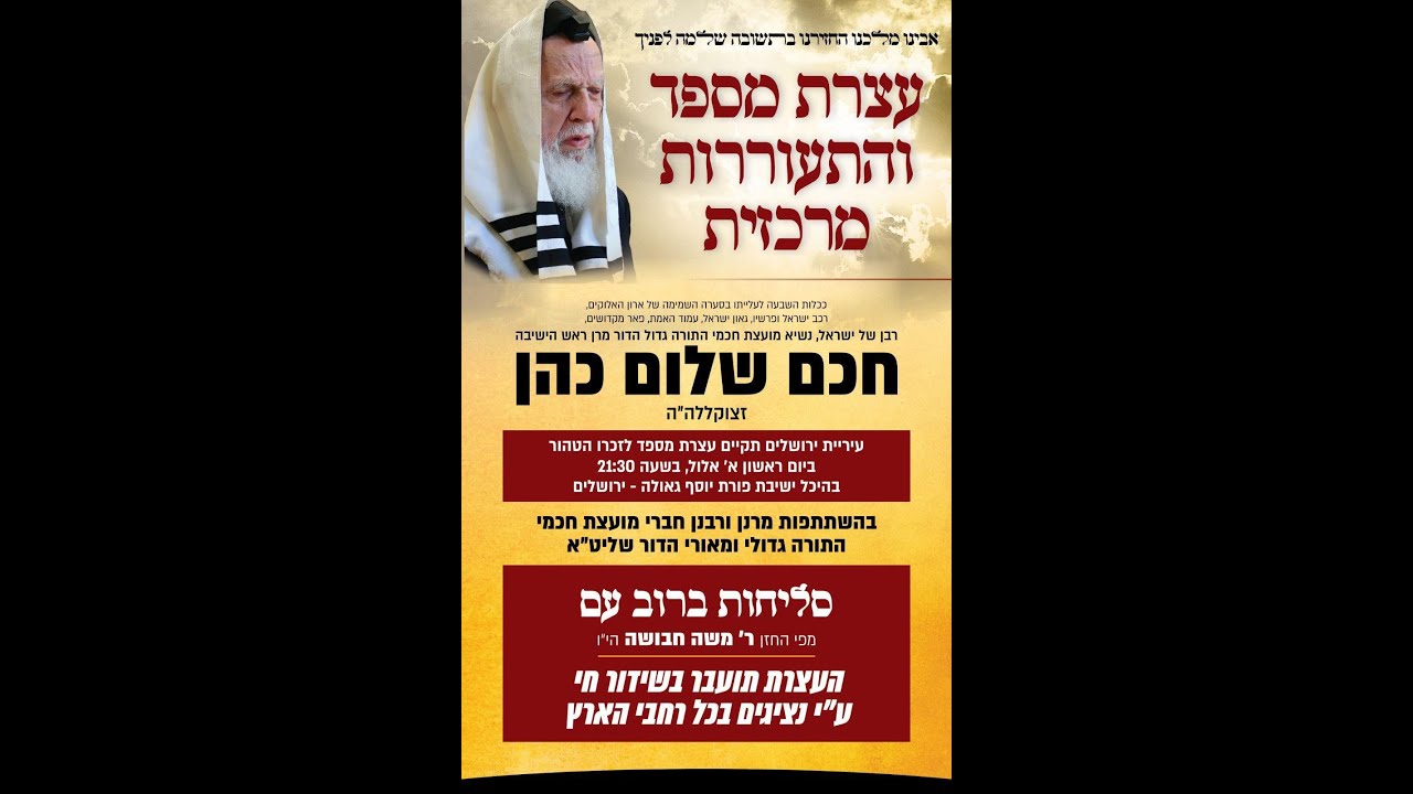 צפייה ישירה ב-YouTubeעצרת הספד והתעוררות במלאת השבעה לפטירתו של גדול הדור מרן ראש הישיבה הגאון חכם שלום כהן זצ”ל