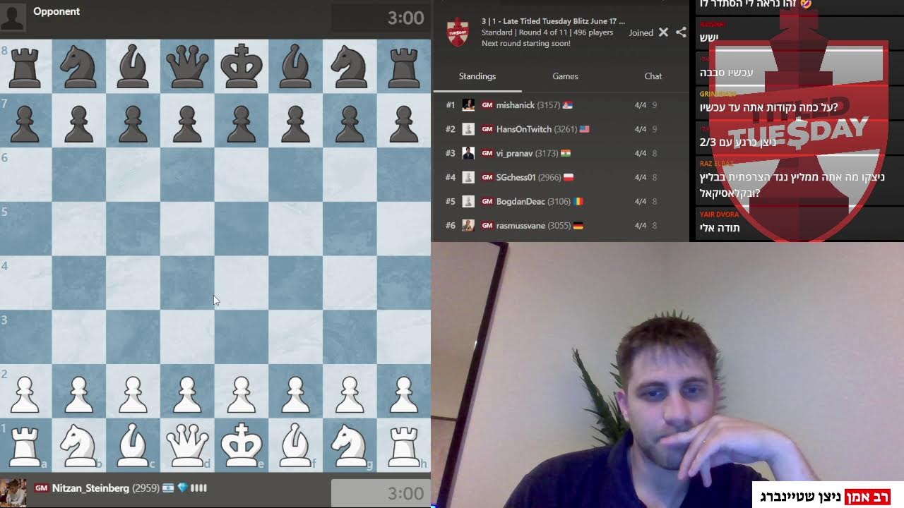 טייטלד טיוזדי שידור חי! – הפעם למען המדינה, הצבא והגיבורים, שכולם יהיו בריאים ♟️🔥 ברוכים הבאים לשידור החי שלי מהתחרות הכי מטורפת בעולם השחמט אונליין – Titled Tuesday של Chess.com, המקום שבו רבי אמנים, שחקני על, וכוכבי יוטיוב נפגשים לקרב ראש בראש בקצב מסחרר! במהלך השידור אני משתתף בתחרות מול השחקנים הכי חזקים בעולם, בשידור חי, עם כל הלחץ, ההפתעות והקרבות הפסיכיים. האם אצליח להדהים את כולם ולבצע את הבלתי יאומן? כל מהלך חשוב, כל שנייה קריטית – ואתם איתי בלייב כדי לראות את הכול קורה בזמן אמת. אם אתם שחקני שחמט, תלמידים, מאמנים או חובבי תחרויות אונליין, זה הלייב שאתם לא רוצים לפספס. בואו לראות, ללמוד, לצחוק, להתרגש – ואולי גם לעודד אותי בצ'אט תוך כדי הקרב! 📌 אל תשכחו ללחוץ לייק, להירשם לערוץ, ולהגיב – מי לדעתכם ינצח בטורניר הלילה? #שחמט #TitledTuesday #שחמטבשידורחי #רבאמןניצןשטיינברג #שחמטישראלי #שחמטביוטיוב #תחרותשחמטאונליין #GMשחמט #לייבשחמט #Chesscom #שחקנישחמט 🎓 לימוד שחמט בכיף לילדים: 🔹https://www.chessworld.io/ 🔹אייפון: https://apps.apple.com/us/app/chessworld-chess-for-kids/id1112656776 🔹אנדרואיד: https://play.google.com/store/apps/details?id=com.altermanchess.AltermanChessEdu 🎁 קוד קופון בלעדי: קבלו 20% הנחה על רכישת מנוי מתקדם באפליקציה הקוד: nitzan2025 ,בתוקף עד ה־30.9 הירשמו בחינם לאתר שידהים אותכם! באמצעותו תוכלו ללמוד פתיחות, לשנן וריאנטים, לשפר את הזיכרון ולהשתפר בשחמט ופשוט לנצח. https://www.chessshare.com/# ♟️ הירשמו ל-Outpost – הבית החדש לשחקני שחמט: https://outpostchess.com/?utm_source=YouTube&utm_medium=Nitzan אימייל לשליחת משחקים עבור נחש את מד הכושר ונחש את הערכת העמדה! nitzan.steinberg18@gmail.com 🎯 הצטרפו עכשיו לקבוצת הליצ'ס של הקהילה! 🏆 תחרויות, פרסים, ועוד הפתעות! 🔗 https://lichess.org/team/DR3Y5DS6 | סיסמה: 2025! 💙 נהנים מהתכנים שלי? אפשר לתמוך כאן: https://www.paypal.me/NitzanSteinbergChess 📱 הרשתות החברתיות שלי: 🔹 אינסטגרם: https://www.instagram.com/nitzan_steinberg_/ 🔹 טוויץ': https://www.twitch.tv/nitzansteinbergchess 🔹 פייסבוק: https://www.facebook.com/nitzan.steinberg 🔹 דיסקורד: https://discord.com/invite/t8Anrz5VpM 🔹טוויטר: https://twitter.com/SteinbergNitza1 🔹ערוץ יוטיוב באנגלית: https://www.youtube.com/@UCOPwWRP_SvWb7r6pnfs41Ww 🔹לינקדין: https://www.linkedin.com/in/nitzan-steinberg-a62112217/ 💬 קבוצת וואטסאפ פתוחה: 🔹https://chat.whatsapp.com/EdTr2ZCClu1HX9HHEpEhsx ♟️ פרופילים אישיים שחמט 🔹פידה: https://ratings.fide.com/profile/2801795 🔹בצ'ס קום: https://www.chess.com/member/nitzan_steinberg 🔹בליצ'ס: https://lichess.org/@/Nizi3