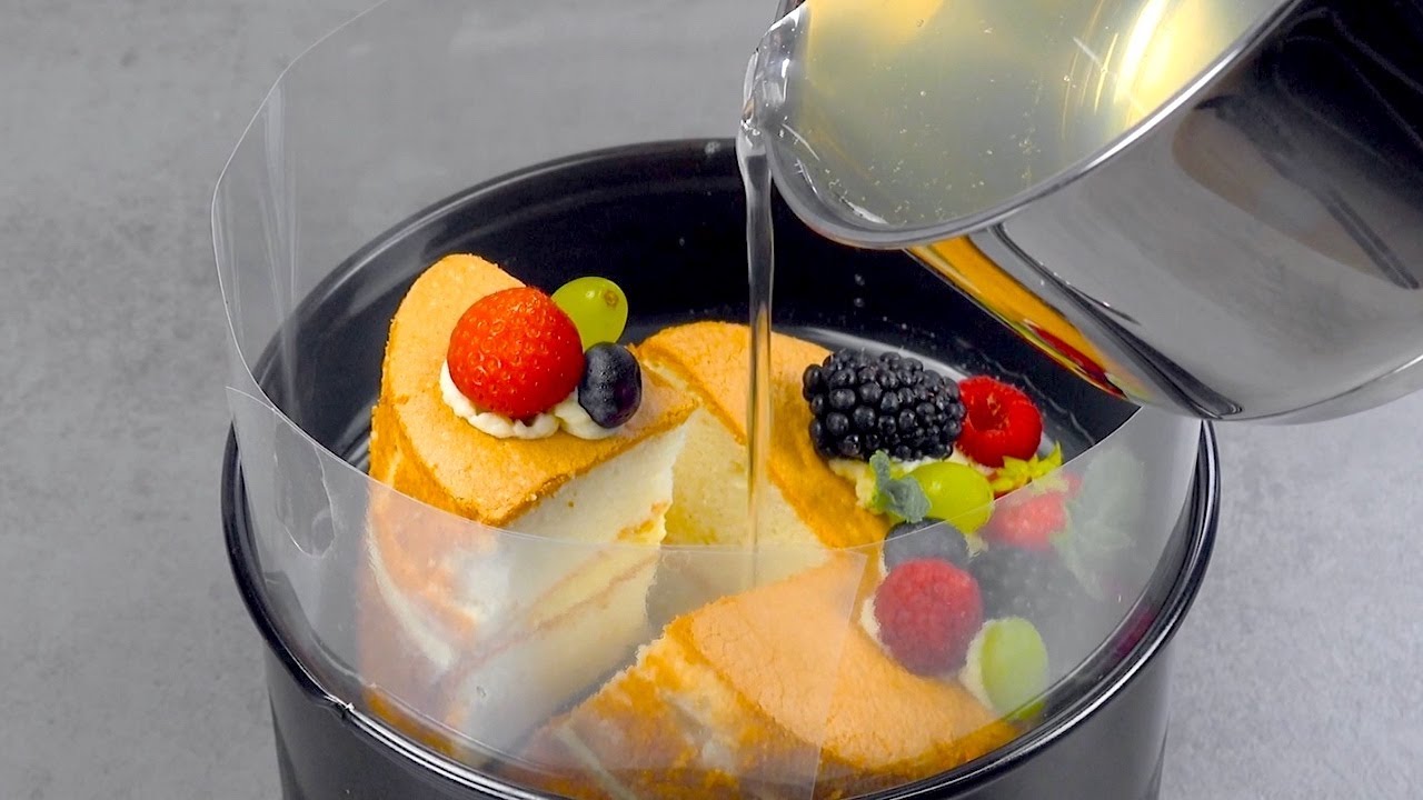 Magical Floating Cake Suspended In Jello ⬇️ SCRUMDIDDLYUMPTIOUS RECIPE BELOW ⬇️ Cakes are a delicious part of special occasions, but sometimes it's hard to find the right recipe to make your cake stand out from the ones you've made in the past. This magical floating cake is just the recipe for you! It might take a little bit of patience, but the end result will bring some unexpected magic into the kitchen! *COMING SOON* We’re working hard to bring you our FIRST COOKBOOK EVER! Stay tuned! 📕🥳 📌 FULL RECIPE: https://www.scrumdiddlyumptious.com/floating-jello-cake/ ➡️ Thanks for watching and don't forget to subscribe for a first-hand look at all our best recipes and cooking hacks: www.youtube.com/scrumdiddlyumptious ****************************************************** You'll Need: For the transparent jello: - 2½ qts water - 1 cup sugar - juice of 1 lemon - 1¼ cups unflavored gelatin powder For the floating cake: - 3 egg whites - ½ cup sugar - ½ tsp vanilla extract - 1 pinch of salt - ¼ cup vegetable oil - ¼ cup milk - ¾ cup flour For the buttercream frosting: - 1 stick butter, softened - 1 cup powdered sugar - 2 tbsp cream cheese For the toppings: - mixed fruit - fresh mint Extra: - 2 x 5-inch springform pans - tall 7-inch springform pan (or extra ring) - cake collar Here's How: 1. For the transparent jello, soak the unflavored gelatin powder and sugar in the water and lemon juice for 5 minutes. Heat the mixture to 160°F, making sure to remove any foam. Once it has heated up, remove it from the heat and let it cool down to 95°F. Line the 7-inch springform pan with a cake collar, then transfer it to the refrigerator to chill. Once the cake collar is cold, spoon a ladle of transparent jello into the springform pan, transfer it to the refrigerator, and chill until the jello has set. Fill the springform pan with 1 inch of transparent jello, transfer it back to the refrigerator, and let the jello set. Be sure to skim off any bubbles that form when pouring in the transparent jello. 2. For the floating cake, preheat the oven to 350°F and grease both 5-inch springform pans. Beat the egg whites, vanilla extract, and salt together. Gradually add in the sugar, beating continuously for about 5 minutes. Stir in the vegetable oil and milk, then pass the flour through a fine sieve into the mixing bowl and stir everything together until combined. Divide the batter evenly between the 2 springform pans, transfer to the oven, and bake at 350°F for 30 minutes. Remove them from the oven and let them cool. 3. For the buttercream frosting, beat the softened butter until it becomes fluffy, then pass the powdered sugar through a fine sieve and beat the mixture until the powdered sugar has been incorporated. Fold in the cream cheese and stir everything together thoroughly. Frost the top of 1 of the cakes with buttercream frosting, then place the second cake on top. Decorate the top of the cake with mixed fruit, securing the fruit in place with some frosting. Transfer the cake to the refrigerator and let it chill for 30 minutes. 4. Angle the 7-inch springform pan by placing 1 side on top of a ramekin. Pour enough transparent jello into the springform pan to create a sloped layer, making sure to leave some of the flat layer exposed. Transfer the angled springform pan to the refrigerator and let the jello set. 5. Return the springform pan back to a level surface and place a few pieces of fruit on the flat layer. 6. Cut a large piece out of the cake and set it aside for later. Place remainder of the cake, a few pieces of fruit, and some mint on the sloped layer of transparent jello. Carefully pour the transparent jello into the springform pan so that it reaches halfway up the cake. Transfer the springform pan to the refrigerator and let the jello set. 7. Once the jello has set, place the slice of cake on top of the most recent layer of jello. Pour the remainder of the transparent jello into the springform pan, leaving the top of the cake uncovered. Transfer the springform pan to the refrigerator and chill for 2 hours. Carefully remove the ring and cake collar from the springform pan. Decorate the cake with some additional mixed fruit and mint leaves. Get the recipe for the Summer Melon Ball Cake featured in the bonus video: https://youtu.be/FqJRg-Ta9nQ ****************************************************** Do you want to see more content like this? Scrumdiddlyumptious brings you unique recipes & cooking hacks every day, so be sure to subscribe, like, and follow us for a first-hand look at new videos that you can share with your family & friends! 💚 YouTube: https://www.youtube.com/scrumdiddlyumptious 💚 Facebook: https://www.facebook.com/scrumdiddlyumptiouscom 💚 Instagram: https://www.instagram.com/scrumdiddlyumptious_recipes 💚 Pinterest: https://www.pinterest.com/scrumdiddlyumptious 💚 Website: https://www.scrumdiddlyumptious.com ******************************************************