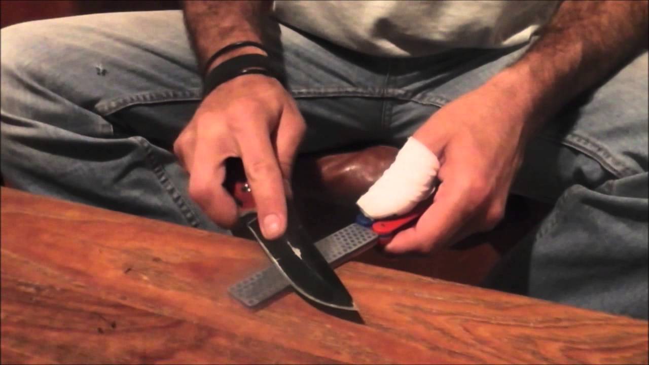 הסכין הזו משמשת סכין שאותה אני נותן למי שאין לו סכין בסדנאות. כאן אני מתקן לה את הלהב בעזרת משחזות יהלום של חברת DMT. זו הפעם הראשונה שבה אני עובד עם המשחזות ולמרות הפציעה היה ממש קל לעבוד איתן. הלהב הייתה שמישה כבר אחרי 5 דקות ואחרי 10 הייתה במצב מושלם. הסרטון מציג טכניקות שונות לעבודה.