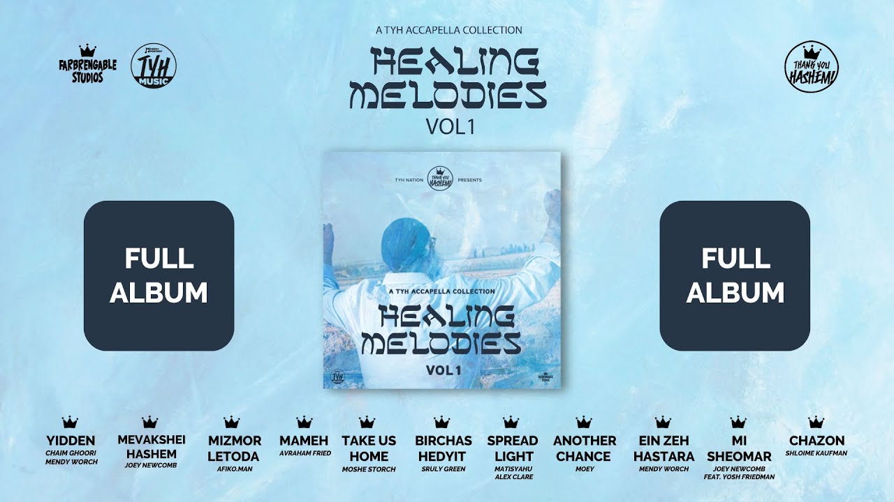 TYH Nation Presents Healing Melodies NEW ACAPELLA ALBUM Healing melodies, a collection of songs appropriate for the introspective time of the year of Bein Hamitzorim. These are vocal versions of the songs we use to focus our avodah on yearning for Moshiach and increasing our closeness with Hashem. 0:00 - 3:07 1. Yidden / Chaim Ghoori - Mendy Worch 3:08 - 5:51 2. Mevakshei Hashem / Joey Newcomb 5:52 - 9:27 3. Mizmor Letoda / Afiko.man 9:28 - 13:39 4. Mameh / Avraham Fried 13:40 - 18:00 5. Take us Home / Moshe Storch 18:01 - 21:51 6. Birchas Hedyit / Sruly Green 21:52 - 25:18 7. Spread Light / Matisyahu - Alex Clare 25:19 - 28:55 8. Another chance / Moey 28:56 - 32:099. Ein zeh Hastara / Mendy Worch 32:09 - 37:09 10. Mi Sheomar / Joey Newcomb - ft. Yosh Friedman 37:10 - 40:29 11. Chazon / Shloime Kaufman For bookings: +1 (347) 680-4862 bookings@gmail.com TYH Music / Mendy Portnoy / Farbrengable Studios Arranged by Mordy Weinstein & Mendy Portnoy