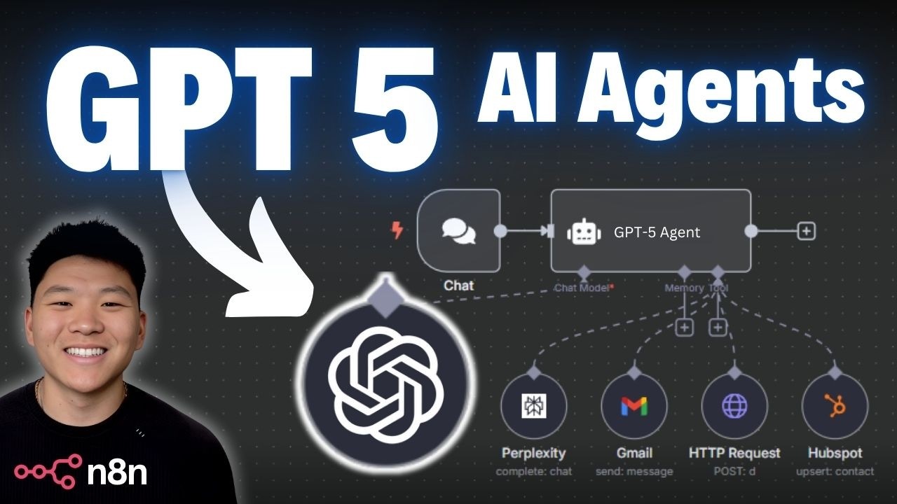 Full courses + unlimited support: https://www.skool.com/ai-automation-society-plus/about?el=build-anything-with-gpt-5-and-n8n-ai-agents All my FREE resources: https://www.skool.com/ai-automation-society/about?el=build-anything-with-gpt-5-and-n8n-ai-agents Apply for my YT podcast: https://podcast.nateherk.com/apply Work with me: https://uppitai.com/ My Tools💻 FREE MONTH voice to text: https://get.glaido.com/nate Code NATEHERK for 10% off VPS (annual plan): https://www.hostinger.com/vps/claude-code-hosting In this video, I break down why GPT-5 is such a big deal for no-code builders and how it supercharges AI agent capabilities in n8n. We’ll look at how it enhances tool calling, improves image prompt generation, and opens up entirely new workflow possibilities. Then I’ll actually get in n8n and play around with stuff. We’llI build a GPT-5 powered agent, then run live evaluations to prove just how much more powerful it is compared to previous models. You’ll see real examples, creative use cases, and practical ways to start applying GPT-5 to your own workflows today. If you’ve been wondering whether it’s worth upgrading your AI stack, this video will show you exactly why GPT-5 is a game-changer and how you can get it running in minutes. Sponsorship Inquiries: 📧 nate@smoothmedia.co Connect with me: https://www.linkedin.com/in/nateherkelman/ https://x.com/nateherk https://www.instagram.com/nateherk/ TIMESTAMPS 00:00 What is GPT-5? 02:40 GPT-5 Benchmarks 05:14 GPT-5 + n8n 06:30 Connecting to GPT-5 in n8n 08:11 Evaluating GPT-5 vs GPT-4o 12:25 GPT-5 Tool Calling 14:13 GPT-5 Image Prompting 15:45 Want to Master n8n? Gear I Used: Camera: Razer Kiyo Pro Microphone: Blue Yeti USB