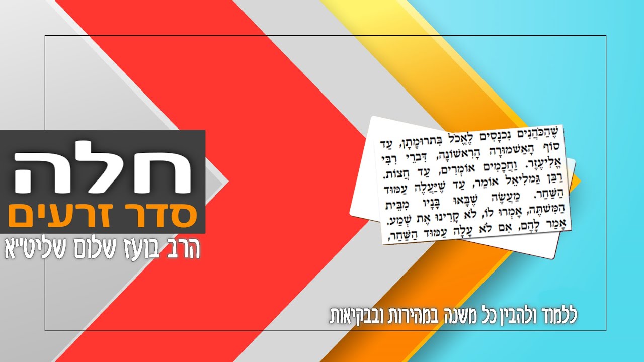 המשנה היא קובץ של פרשנויות על המקרא שתרם רבות לעיצוב היהדות וארגון החיים היהודיים לאחר חורבן הבית השני. המשנה חוברה במשך כמה דורות משלהי ימי הבית השני ובעיקר ב-150 השנים שעברו מאז חורבנו בשנת 70 לספירה. המשנה מחולקת לשישה 'סדרים', המכילים כל אחד מספר 'מסכתות'. כל מסכת עוסקת בנושא ספציפי אחד המרומז בשמה של אותה המסכת. סדרי המשנה נועדו להוות קו מנחה ובסיס איתן לשם קביעת ההלכות בקהל ישראל, לדורות. סדר זרעים – עוסק בברכות ובמצוות התלויות בארץ. מכיל 655 משניות ב-11 מסכתות. סדר מועד – עוסק בשבתות, חגים ותעניות. מכיל 681 משניות ב-12 מסכתות. סדר נשים – עוסק באישות, קידושין, גירושין וכדומה. מכיל 578 משניות ב-7 מסכתות. סדר נזיקין – עוסק בדיני ממונות וסדרי המשפט. מכיל 685 משניות ב-10 מסכתות. סדר קדשים – עוסק בבית המקדש ובקורבנות. מכיל 590 משניות ב-11 מסכתות. סדר טהרות – עוסק בסוגי טומאות וטהרתן. מכיל 1,003 משניות ב-12 מסכתות. שישה סדרי משנה סדר זרעים: ברכות, פאה, דמאי, כלאיים, שביעית, תרומות, מעשרות, מעשר שני, חלה, עורלה, ביכורים. סדר מועד: שבת, עירובין, פסחים, שקלים, יומא, סוכה, ביצה, ראש השנה, תענית, מגילה, מועד קטן, חגיגה. סדר נשים: יבמות, כתובות, נדרים, נזיר, סוטה, גיטין, קידושין. סדר נזיקין: בבא קמא, בבא מציעא, בבא בתרא, סנהדרין, מכות, שבועות, עדויות, עבודה זרה, אבות, הוריות. סדר קודשים: זבחים, מנחות, חולין, בכורות, ערכין, תמורה, כרתות, מעילה, תמיד, מידות, קינים. סדר טהרה: כלים, אוהלות, נגעים, פרה, טהרות, מקוות, נידה, מכשירין, זבים, טבול יום, ידיים, עוקצים. הרב בועז שלום שליט"א הוציא בשנים האחרונות אלפי שיעורי תורה במגוון נושאים. שיעורים מעמיקים בתנ"ך, משנה, דף היומי, מחשבה, מוסר, הלכה, אגדה, עין יעקב, אור החיים, חומש עם רש"י, כלי יקר, דרשות על פרשת שבוע, ועוד. הרב מכהן כיו"ר ארגון 'טעמו וראו', וראש מדרשת 'בית אליהו' ברחוב דב גרונר 11 בבני ברק. במשך שנים עסק הרב במסירת הרצאות ובקירוב רחוקים בארגון 'ערכים' ובערוץ 'הידברות' במגוון נושאים. כמו כן מוסר הרב שיעורים קבועים במדרשת 'פסגות' שברחוב בן ציון גליס 37 אזוה"ת סגולה בפ"ת. הרב בועז שלום חיבר שני ספרים 'משנת החלומות' ו'משנת הגלגולים'. לרב בועז שלום אתר אינטרנט בשם "טעמו וראו" שם תוכלו למצוא את כל שיעוריו בכתובת https://taamu.co.il השיעורים ניתנים לשמיעה ואף להורדה בחינם. באתר ניתן אף להעיר או לשאול על השיעורים ולקבל את תגובת הרב. זכות השיעור לעילוי נשמת אברהם בן ימנה ויעקב ויוסף בן אורה וחיים.