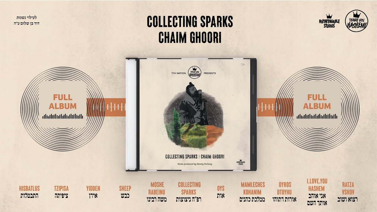 TYH Nation Presents COLLECTING SPARKS Chaim Ghoori Devarim Hayotzim Min Halev, these songs come from deep within my heart and represent our collective avodah of התבטלות eedeeming sparks. Powered by deep teachings of kabbala and the Tzaddikim, complemented by years of learning at the feet of my rabbeim and mentors, my desire is that these songs and the Torah behind them should be able to penetrate through any barriers and enter the place where they can resonate and invigorate. So please open your heart and enjoy! - Chaim For bookings: +1 (347) 680-4862 bookings@gmail.com Farbrengable Studios Music produced by Mendy Portnoy Cover art by Yehuda Raice Thank you to: The Bloomstein Brothers. Mendy Portnoy. Yehudah Pinsker. Yossi Gerson. Yaakov Galen. Shui Fier. Tzivya Kravitz. Izzy D. Yaakov Wohlgelernter. Motty Berkowitz. לעילוי נשמת דוד בן שלום ע״ה