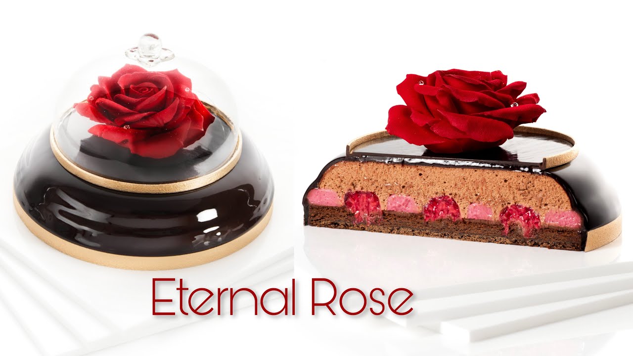 This really romantic dessert was made with a variety of fun techniques! It's composed with a base of crunchy chocolate sable, a light gluten free chocolate sponge, a Raspberry chocolate ganache, a fresh Raspberry and Yuzu compote, a soft Raspberry cremeux and a very light chocolate mousse. The rose is made with homemade modeling chocolate and the dome is made with sugar!
