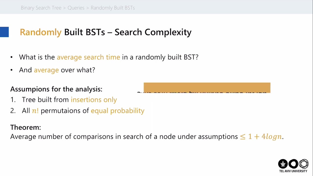 ביחידה זו נציג את הטענה שכאשר עץ חיפוש בינארי נבנה באופן אקראי (על ידי הכנסות בלבד), תוחלת גובה העץ תהיה O(logn). בואו ללמוד את הקורס המלא באתר קמפוסIL: https://campus.gov.il/course/tau-acd-rfp4-tau-data-structures/