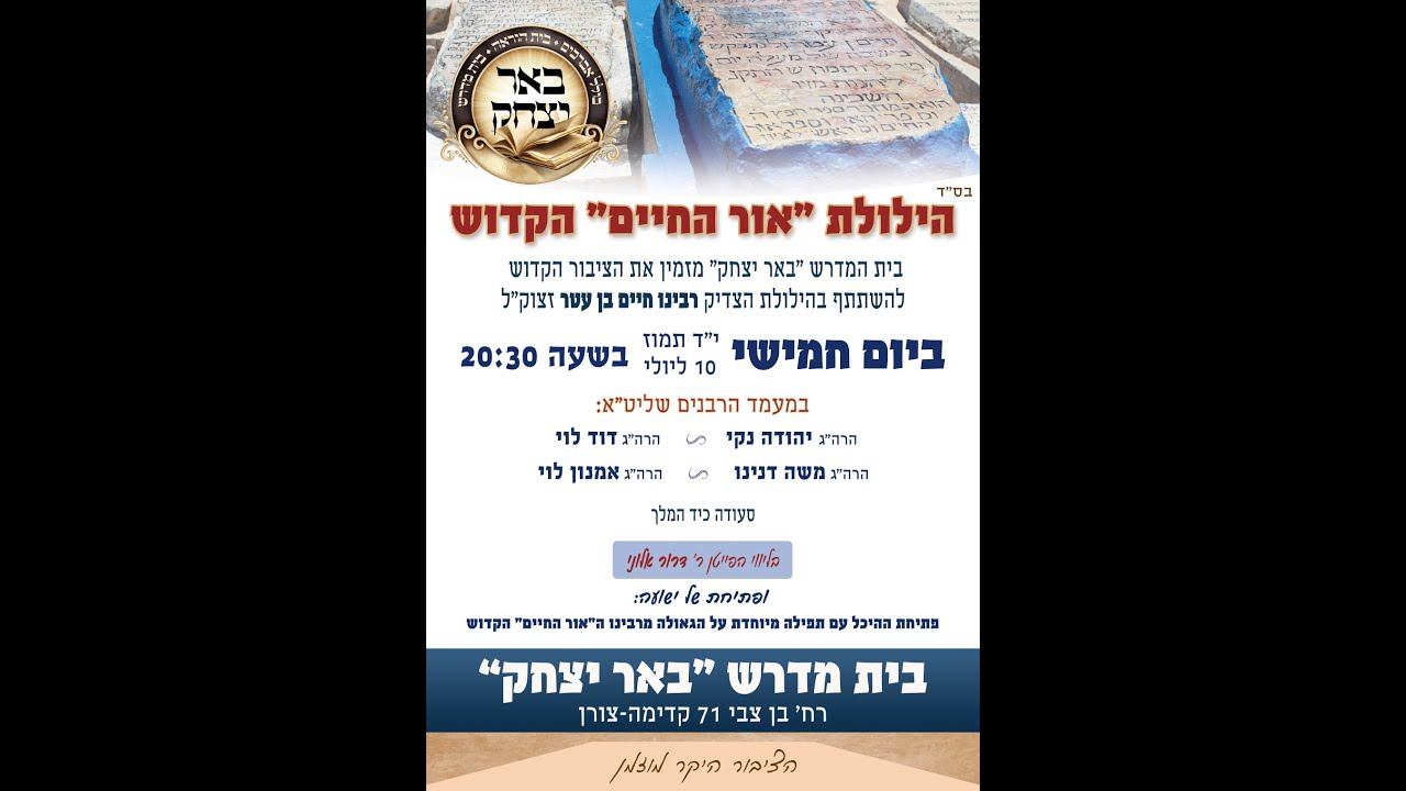 https://www.youtube.com/@beer-itzhak https://beer-itzhak.co.il/ תזכה בשותפות באחזקת המקום הקדוש "חדש!!! עכשיו גם אפליקציה במכשירי אנדורייד ואפל " באר יצחק עקבו אחרינו ושתפו חברים לצפייה במגוון שיעורים מפי מיטב הרבנים שיעורים מתקיים בכל יום מהשעה 19:00-20:00 & 20:15-21:45 הירשמו כמנויים ובכך מגדילים את זיכוי הרבים בבית המדרש באר יצחק - קדימה רח' בן צבי 71 https://beer-itzhak.co.il/