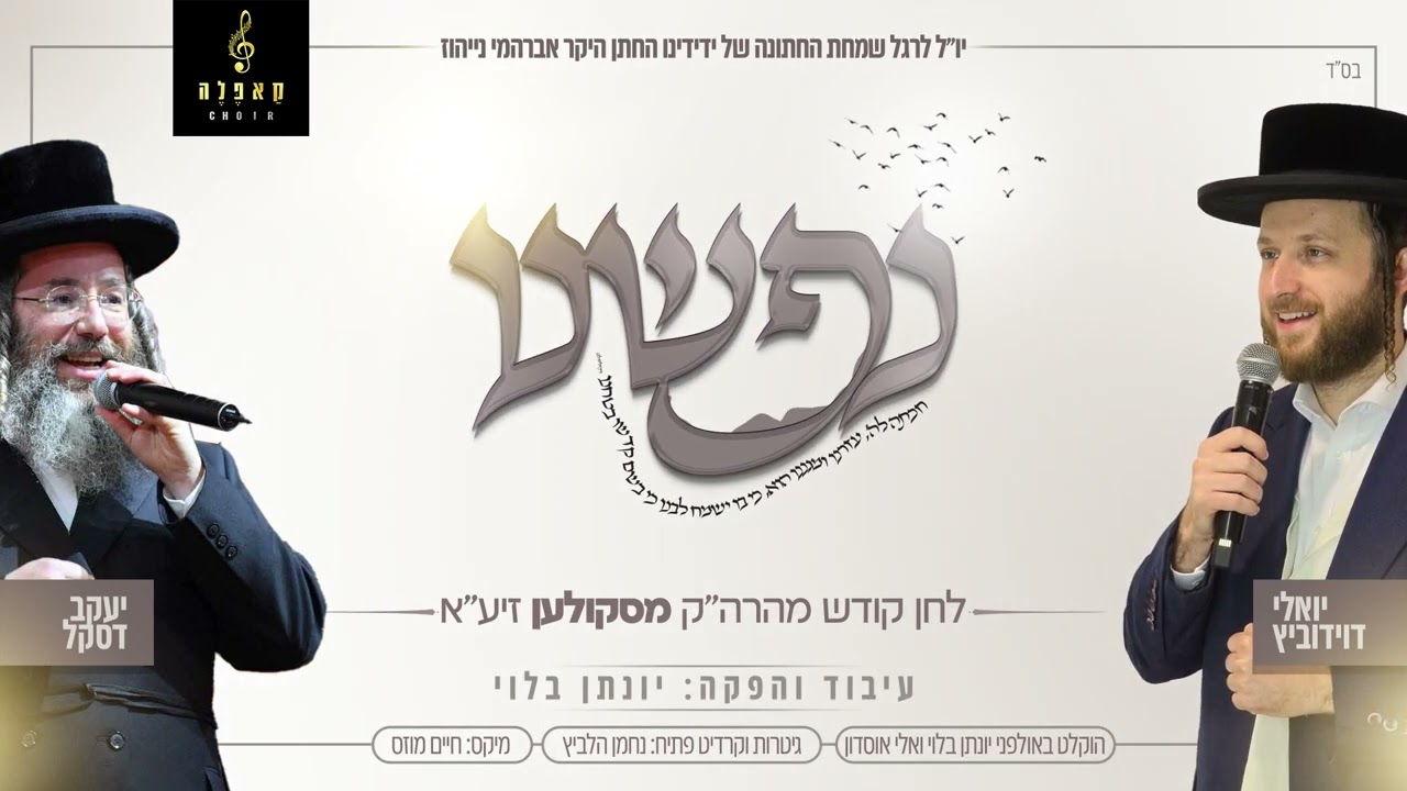 יואלי דוידוביץ ויענקי דסקל מחדשים את השיר ״נפשינו״ בלחנו הק’ של הרה״ק מסקולען זיע״א, כשעל הקולות מקהלת ‘קאפלה’. השיר יצא לאור לרגל שמחת החתונה של ידידם המשותף החתן אברהמי נייהוז. ביוזמתו והפקתו של יונתן בלוי אשר גם מופקד על העיבוד המוזיקלי, הליין של הגיטרות הוקלטו בידי נחמן הלביץ. קרדיטים: שירה: יואלי דוידוביץ ויענקי דסקל | לחן: הרה״ק מסקולען זיע״א | קולות: מקהלת קאפלה | גיטרה: נחמן הלביץ | מיקס: חיים מוזס | הוקלט באולפני יונתן בלוי ואלי אוסדון | גרפיקה: סטודיו אביתר | תמונת יענקי דסקל - צילום: יהושע פרוכטר | הנפשה: שניאור אייזנבך | יח״צ: בעריש פילמר