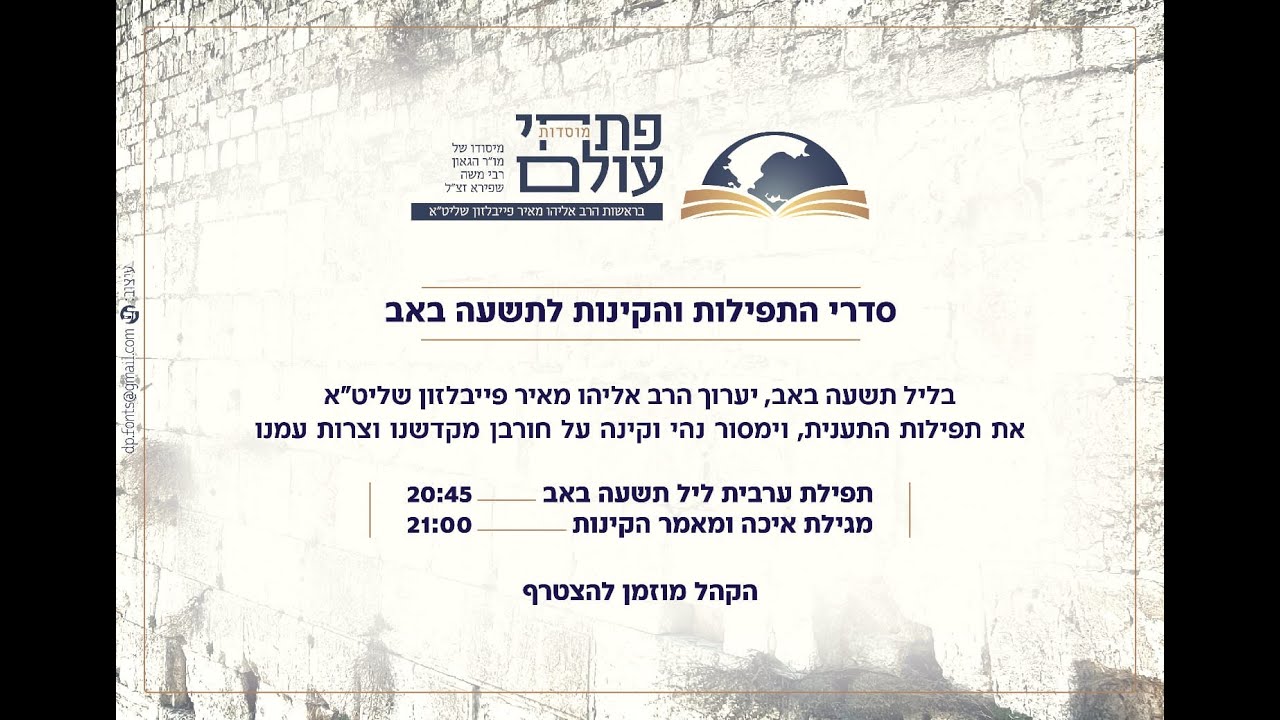 צפייה ישירה ב-YouTubeנהי וקינה מאת הרב אליהו מאיר פייבלזון שליט”א ראש ישיבת פתחי עולם | תשעה באב תשפ”ד – עיה”ק ירושלים