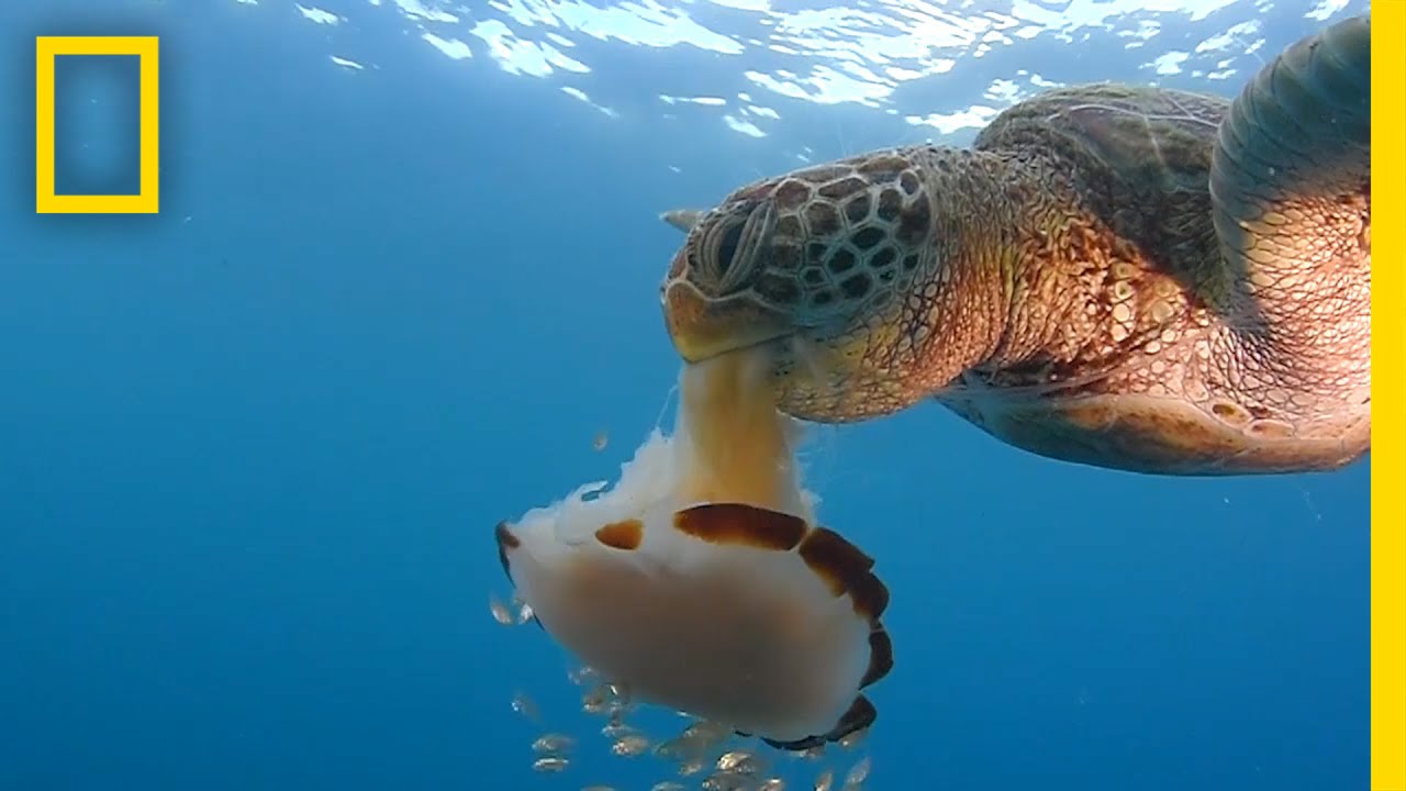 A marine biologist captured footage of a green sea turtle enjoying a stinging meal - a jellyfish. ➡ Subscribe: https://on.natgeo.com/4p5A0D6 ➡ Access our digital archive by becoming a member of National Geographic: https://on.natgeo.com/39AJG1V #NationalGeographic #SeaTurtles #Jellyfish About National Geographic: National Geographic is the world's premium destination for critically acclaimed storytelling around science and exploration. Discover amazing wildlife, ancient civilizations, hidden worlds, and the incredible wonders of our Earth. Through world-class scientists, photographers, journalists, and filmmakers, Nat Geo inspires fans of all ages to connect with, explore, and care about the world. Get More National Geographic: Official Site: https://nationalgeographic.com Instagram: https://instagram.com/natgeo Facebook: https://facebook.com/natgeo Threads: https://threads.com/@natgeo X: https://x.com/NatGeo LinkedIn: https://linkedin.com/company/national-geographic TikTok: https://tiktok.com/@natgeo Reddit: https://reddit.com/user/nationalgeographic TikTok: http://www.tiktok.com/@natgeo Tenor: http://on.natgeo.com/31b3Koc Jellyfish paralyze prey using neurotoxins in their tentacles, but the turtle does not seem to be affected. It closes its eyes and uses its flipper as a shield from the jellyfish’s stinging tentacles. Green sea turtles are endangered. Their main threat is overexploitation of eggs from the beaches they are laid on. Green sea turtles are predominately herbivorous, but juveniles have been known to feed on jellyfish. Click here to read more about the sea turtle and the jellyfish. https://bit.ly/2YI7xGv See a Sea Turtle Devour a Jellyfish Like Spaghetti | National Geographic https://youtu.be/PA66nEJYaAU National Geographic https://www.youtube.com/natgeo