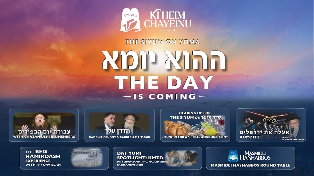 As Daf Yomi learners worldwide complete Maseches Yoma, Ki Heim Chayeinu once again brings to you an inspirational and exciting Siyum celebration. Hahu Yoma – The Day is Coming will no doubt be another unique global event in honor of our Daf Yomi heroes. The extensive program will keep you and your family fascinated as different parts of the Masechta are brought to life through song, speakers, and various visual presentations. And falling out as it does in the middle of the Three Weeks, this is the perfect opportunity to discover more about the Beis Hamikdash and the Avodah. Tune in on Thursday, July 8, and celebrate The Siyum on Yoma together with scores of thousands of Yidden worldwide. Unique features include a Musical Avodas Yom HaKippurim with Chazzan Ushi Blumenberg, accompanied by the Yedidim choir, and a virtual tour of the Beis Hamikdash with renowned expert R’ Yoav Elan taking us literally into the Beis Hamikdash, giving us a better understanding of Yoma as well as linking Maseches Yoma with the Three Weeks, awakening our yearning for the Third Beis Hamikdash. Sing along with R’ Mendy Werdiger and the Yedidim Choir leading the A’aleh Es Yerushalayim Kumzitz! Watch Ki Heim Chayeiu’s newest fascinating video features following the Lomdei Hadaf from Siyum to Siyum, as we journey through Shas, with a spotlight Daf Yomi Chaburah KMZD. Look out for an exclusive introduction to the all-new Masmidei HaShabbos program, which will debut this summer in camps across the country, and a monumental historic announcement about the upcoming Siyum on Seder Moed in March 2022. This Siyum promises to be a night to remember; don’t miss out! Hahu Yoma- The day is coming…