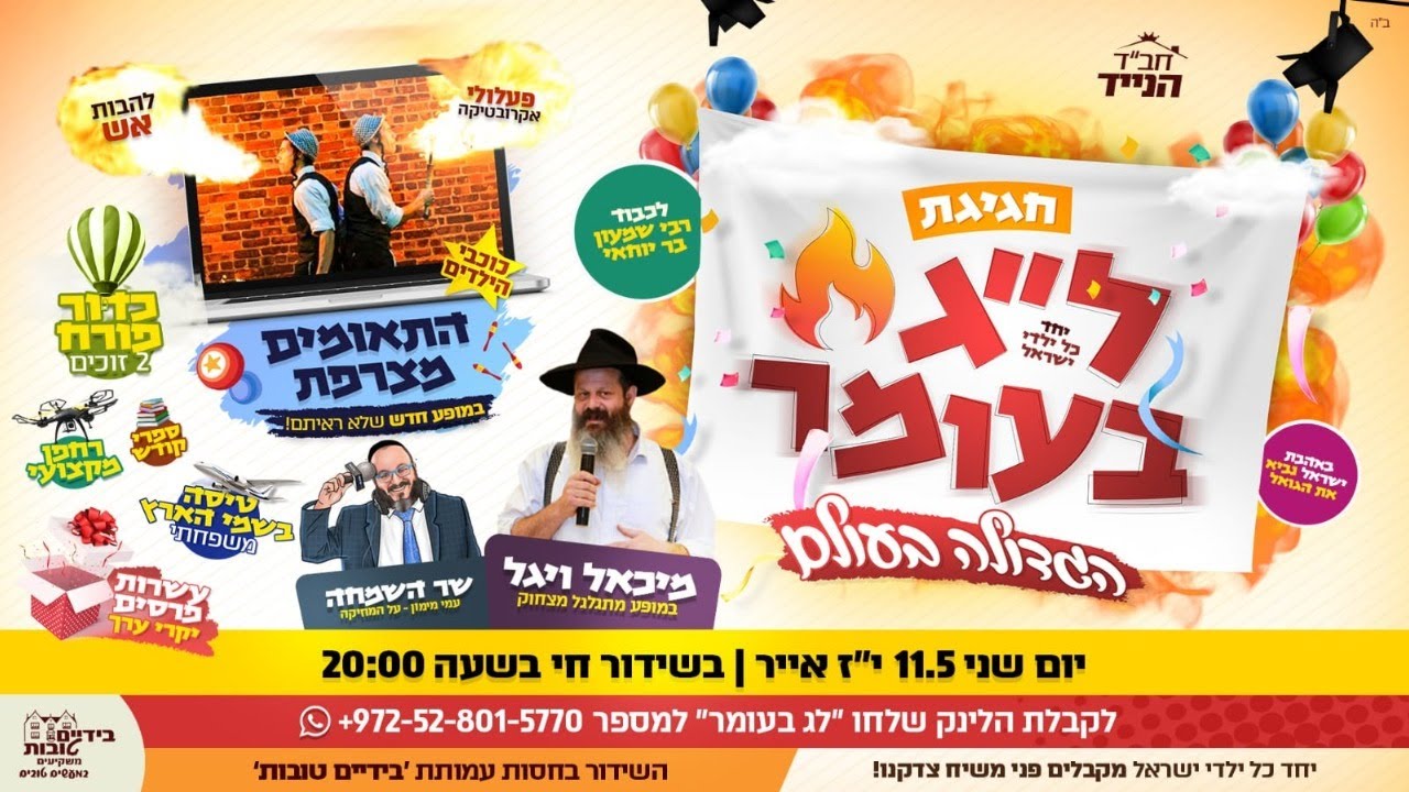 הזוכים בהגרלה: 1. מרים אסתר הדר, פתח תקווה - כדור פורח | קיבלה החלטה טובה לתת צדקה בכל יום 2. דבורי ברקו , פתח תקווה - כדור פורח | לתרום צדקה לפני התפילה 3. משפחת רוזנברג , בית שמש - טיסה בשמי הארץ משפחתית 4. משפחת ישראל - זכו קורקינט 5. משפחת אברהם - זכו ברחפן 6. משפחת כהן , בית שמש - זכו בפרס 7. שמואל רז - זכה בפרס 8. מנדי אלחרר - זכה בפרס 9. מוסי ומוישי לוין מלוד - זכו בפרס 10. משפחת הסופר - זכו בפרס | החלטה טובה: לא לדבר לפני נטילת ידיים בבוקר 11. משפחת ליפש - זכו בפרס | מקבלים על עצמם לומר פרק של הרבי בתהילים כל יום 12. ישראל דרור לבנון - זכה בפרס | החלטה טובה: לתת צדקה בכל יום 13. שמואל .פ - זכה בפרס | החלטה טובה: לומר 3 פרקי רמב"ם בכל יום 14. טליה לירן - זכתה בפרס | החלטה טובה: לוותר לאחים שלי יותר במשחקים ............... רוצים להצטרף לשידורים הבאים ולקבל כרטיסי הגרלה? מלאו את הפרטים בטופס. https://um2020.wixsite.com/33770 חגיגת ל"ג בעומר לכל המשפחה! 👩👩👦👦 הכנו בשבילכם תוכנית מרתקת מעניינת במיוחד, שתעביר לילדים מסרים חינוכיים לתת שחשובים להם במיוחד, "לאהוב כל יהודי!" "לתת" "לכבד את ההורים" "לעשות מעשים טובים"... תרצו לזכות בכרטיס טיסה בשמי הארץ משפחתי? להנות ממופע להטוטים עם התאומים מצרפת? הצטרפו אלינו בשעה 20:00 יום שני ערב ל"ג בעומר להצטרפות לקבוצת עדכונים בווטסאפ לקראת השידור כנסו: https://chat.whatsapp.com/HBUgFoPcbOFJj8rFVMq2Nj תיקיית דרייב עם שירי התהלוכה להורדה כנסו כאן: bit.ly/3fCqnbq לכבודו של רשב"י הקדוש שתפו את חבריכם ומכריכם 👍 וביחד נפעל לזירוז הגאולה! תרומת חי' רוטל עבור עמותת בידיים טובות 🙌🏻 ממשיכים להשקיע בחגי ישראל ובילדי ישראל החלטנו לקחת חסות לאירוע המרכזי שיעבור היום בשידור חי בכל הארץ לצורך כך דאגנו לכם לאומנים הכי נחשבים * התאומים מצרפת * שר השמחה עמי מימון * השחקן מיכאל וויגל לקיום המנהג של תרומת חי רוטל עבור הוצאות השידור כנסו ללינק הבא: https://tickchak.co.il/9986 ניתן לתרום בביט/ פייבוקס למספר 0524287700 או בהעברה בנקאית :* בנק: דיסקונט (11) סניף: 515 חשבון: 159140600 על שם: עמותת בידיים טובות בשבילכם תמיד בכל מצב