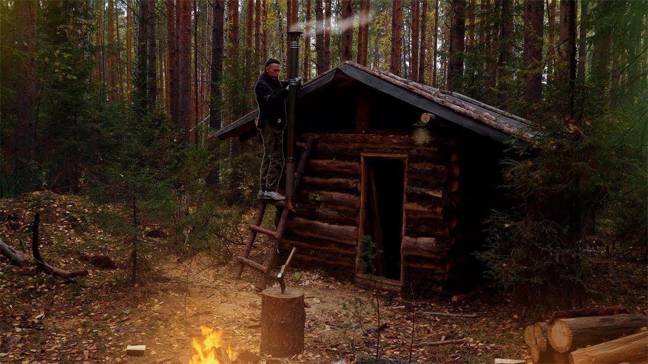 Building a wooden house for winter living. Off Grid Log Cabin. Alone in the forest