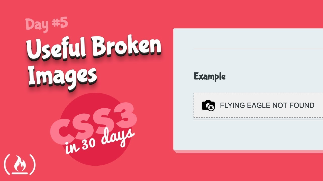 Whether it's a typo in the img tag source, or the image itself was misplaced or removed on the server - images break all the time on the web. The problem is, the browsers default way to display a broken image is really ugly. You can fix that and actually use it as an opportunity to enhance the user's experience on your web pages with CSS! That's what you will learn about in this lesson. ⭐️Files you need ⭐️ 💻Useful Broken Images Code: https://www.dropbox.com/sh/1pceu4wvrzadsgg/AACHHW3sJMJrcCI5B5eazAnga?dl=0 💻All tutorials in this series need this "_theme-styles" directory (only download once): https://www.dropbox.com/sh/890hx6ke34oovaz/AAByJ-jb-H5pWuIUx7t_GvQqa?dl=0 This video works as a stand-alone tutorial but is also day 5 of CSS3 in 30 Days. For the rest of the series, check out this playlist: https://www.youtube.com/playlist?list=PLWKjhJtqVAbl1AfjiGyYxwpdAPi5v-1OU CSS3 in 30 Days is developed by Brad Hussey. Check out his website for more great tutorials: https://codecollege.ca/ -- Learn to code for free and get a developer job: https://www.freecodecamp.org Read hundreds of articles on programming: https://medium.freecodecamp.org ❤️ Support for this channel comes from our friends at Scrimba – the coding platform that's reinvented interactive learning: https://scrimba.com/freecodecamp