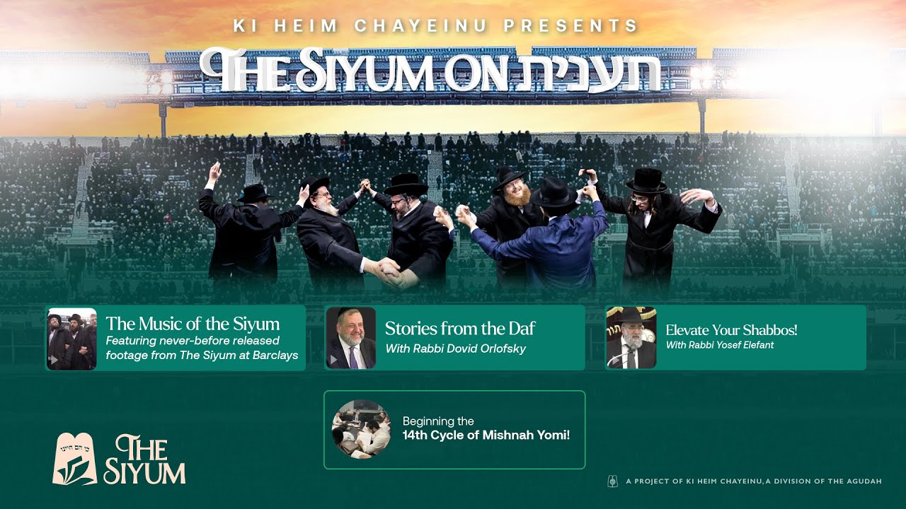 We've all been enjoying our learning of the short Masechtas in Seder Moed, with geshmak of the wonderful agadata gemaras and relatable sugyos, making siyumim together every month. Now, what could be more geshmak than an agatata gemara with lessons and stories from the daf told to us by the one and only, world renowned, Rabbi Dovid Orlovsky? Join us tonight for an incredible program: Ki Heim Chayeinu’s siyum on Maseches Taanis Featuring: Stories from The Daf...Never before released music and dancing from The Siyum at Barclays...Elevate your Shabbos with Masmidei HaShabbos featuring Rav Yosef Elephant Shlit”a... And…Announcing the launch of the 14th Cycle of Mishnah Yomi, with divrei chizuk from gedolei yisroel. Don't miss this exciting program - Streaming LIVE Tonight at 8pm right here and on KHC.GLOBAL. You can call in too - 806-666-4-KHC. Mazel Tov, Mazel Tov! Ki Heim Chayeinu, a division of Agudas Yisrael, has been charged with a mission by the Novominsker Rebbe zt”l to inspire Klal Yisrael, bringing Torah to life, by bringing Torah into our lives. Starting with Maseches Shabbos, Ki Heim Chayeinu launched an initiative to elevate Shabbos, the mekor habrachah, through a deeper understanding of the tefillos and zemiros of Shabbos. To receive our weekly Shabbos emails designed to bring your shabbos table to life, sign up at shabbos@kiheimchayeinu.com and to join the Ki Heim Chayeinu email list for participating the in Torah initiatives that are changing Klal Yisrael, please email info@kiheimchayeinu.com See you TONIGHT!