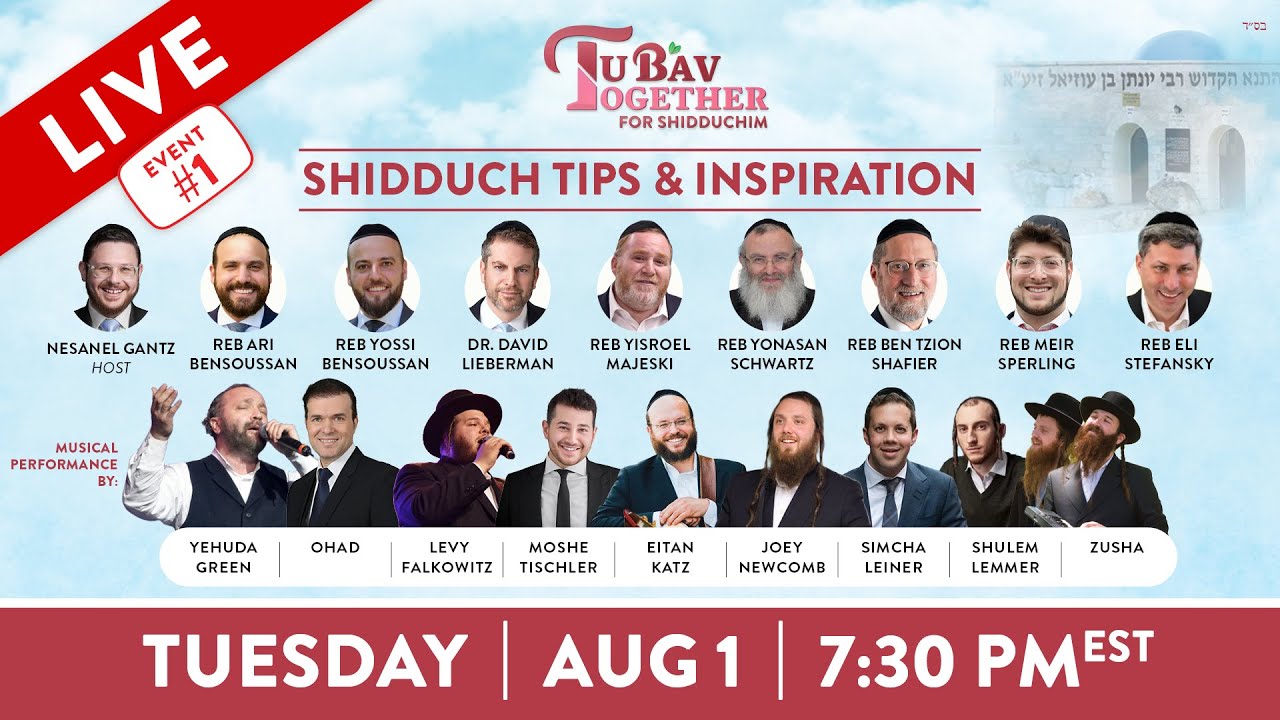 https://tubav2gether.com Join over 30 Rabbonim, Singers, and Shadchanim this Tu B'Av Together in a night of Musical Inspiration! 📧 To submit names( for free) and learn more about Tu B’Av Together, visit https://tubavtogether.com call 1-718-395-5899 Join Klal Yisroel!! Hear directly from leading Rabbinim, Singers, and Shadchanim on Aug 2nd - Tu B’Av! Everything you need to know about Tu B'Av Together 📅 On Tu B'Av (8/2) @10AM EST, Klal Yisrael will daven together for shidduchim! 📖 Join LIVE Tefillah event on Wed (8/2) @10am EST 🎼 Watch LIVE pre-Tu B’Av Musical Event with today’s leading stars on Tues (8/1) @7:30pm 📧 To submit names( for free) and learn more about Tu B’Av Together, visit https://tubav2gether.com call 1-718-395-5899 Even now in 2022 with further access to different types of people - its hard to find a match! This is an opportunity, for the Jews around the world to step up - and care! "The more you talk about shidduchim, the more people redt shidduchim and the more people redt shidduchim, the more shidduchim are made" - Rav Paysach Krohn