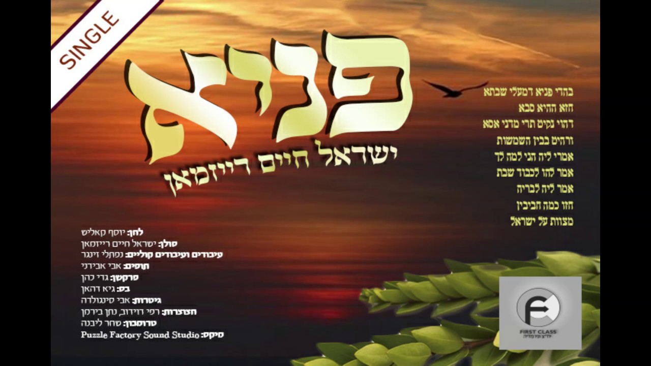 "פניא" לחן מקורי ומיוחד שיוצא לאור בימים אלו כסינגל בכורה להבעל מנגן ישראל חיים רייזמאן המתגורר בעיר וועסטקליף ובקולו המתוק והמרגש שר ומזמר על במות האירועים כבר למעלה מ 15 שנים, וועסטקליף, ממוקמת בבריטניה לא הרחק מעיר הבירה לונדון, שם העיר אמנם פחות מוכר לנו, אבל מסתבר שכשרונות מוזיקאליים בהחלט קיימים שם, מלחין השיר יוסי קאליש מתגורר אף הוא בוועסטקליף. והצלע השלישי שחבר איתם הוא מעבד צעיר ומוכשר שעוד תשמעו עליו רבות נפתלי זינגר, וכששלושה כשרונות נפגשים התוצאה מקצועית ואיכותית . הלחן מושתת על הגמרא במסכת שבת שם מובא שרבי שמעון בר יוחאי מסביר לבנו רבי אלעזר לאחר יציאתם מהמערה על פשרו של אותו זקן שרץ בשמחה ב"פניא דמעלי שבתא "(ערב שבת) בין השמשות עם זוג הדסים בידיו "חזו כמה חביבין מצוות על ישראל" האזנה עריבה ונעימה !!! שירה : ישראל חיים רייזמאן לחן : יוסף קאליש עיבודים ועיבוד קולי : נפתלי זינגר תופים : אבי אבידני פרקשן : גדי כהן בס : גיא דהאן גיטרות : אבי סינגולדה חצוצרות : רפי דוידוב ,נתן בירמן טרומבון : שחר ליבנה מיקס : Puzzle Factory Sound Studio יח"צ ומדיה - פירסט קלאס