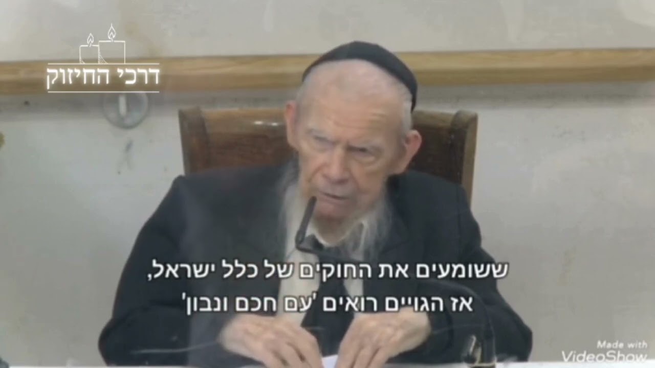 רשכבה"ג מרן רבינו גרשון זיע"א: החוקים נותנים מדריגה מיוחדת לעם ישראל בעיני הגויים, והגויים רואים את החשיבות ומרגישים רגש נחיתות, להלן הדברים. אז מלכות יוון להשכיחם תורתך ולהעבירם מחוקי רצונך, מה זה?, לא רק תורה, גם חוקי רצונך, גם חוקים, תורה עסק התורה, עוסקי רצונך דבר שזה חוקים בלי טעם, שזה לא מובן בכלל, כמו שעטנז, שיש כזה איסור, מה האיסור שעטנז, או כלאיים, כלאי הכרם וכלאי זרעים, מה זה?, חוקים! מחוקי רצונך, ולמה חוקים? למה את החוקים?, על המשפטים לא כתוב, כי דיני ממונות זה דברים מובנים, הגויים מבינים את המשפט העברי, בכל העולם מאד מתענינים בזה, הגויים מתענינים במשפט העברי, בדיני ממונות של היהודים, אבל חוקי רצונך, מה אכפת להם החוקים? יש פסוק כי היא חכמתכם ובינתכם לעיני העמים אשר ישמעון את כל החוקים האלה ואמרו רק עם חכם ונבון הגוי הגדול הזה, כי היא חכמתכם ובינתכם לעיני העמים, זה חכמתכם ובינתכם לעיני העמים, הגויים רואים שאתם חכמים ואתם נבונים, במה? אשר ישמעון את החוקים האלה, ששומעים את החוקים של כלל ישראל, אז הגויים רואים "עם חכם ונבון" ככה כתוב, חוקים זה דבר שלא מבינים. אבל אף על פי כן, הגויים רואים את החוקים, איך שעם ישראל מתנהג עם החוקים, אז אומרים עם חכם ונבון, מחשיבים את עם ישראל, חכם ונבון הגוי הגדול הזה, עם חכם ונבון הגוי הגדול, עם חשוב! חכם ונבון הגוי הגדול הזה, על ידי החוקים, ככה זה, כשרואים את החוקים מקבלים הערכה, מעריכים את עם ישראל, חכם ונבון, כך המציאות. לכן להעבירם מחוקי רצונך, כי היוונים רוצים להוריד את החשיבות של כלל ישראל את המדריגה של כלל ישראל, אז החוקים - אין חוקים, משפטים כן, אבל תורה לא וחוקים לא, כי החוקים נותנים מדריגה מיוחדת לעם ישראל בעיני הגויים, והגויים רואים את זה, רואים את החשיבות ומרגישים רגש נחיתות, מרגישים את עצמם שהם לא כאלה, לכן הם רוצים להעבירם מחוקי רצונך לבטל את החוקים. קרדיט תיעוד: דרכי החיזוק שיחות *נהנתם מהסרטון? תנו לייק והרשמו כמנוי ותתנו לנו את הכוח להמשיך................* צופים יקרים: הקליקו "הירשם כמנוי" ואחר כך לחצו על הפעמון, ואז תהיו המעודכנים הראשונים בכל סרטון חדש שעולה ליוטיוב ! נו, לא כדאי להירשם ? *יש לכם תיעוד וידאו מעולם התורה לפרסום? שלחו אלינו מייל 6701822@gmail.com* *המערכת מכבדת זכויות יוצרים* *התיעודים המתפרסמים בערוץ זה הם ע"פ תורתינו הקדושה, ולהבדיל ע"פ חוקותיהם, חוק זכויות יוצרים תשס"ח 2007 למנינם, סעיף 27א, במידה ובעל המוצר חפץ שנפסיק להשתמש במוצר, או שנייחס הסרטון אליו שלחו לנו מייל לכתובת: 6701822@GMAIL.COM והעניין יטופל.* ********************************************** שימו לב על כל פרסום סרטון שהתפרסם בערוץ זה חובה לציין קרדיט ל'ערוץ בקודש פנימה'.