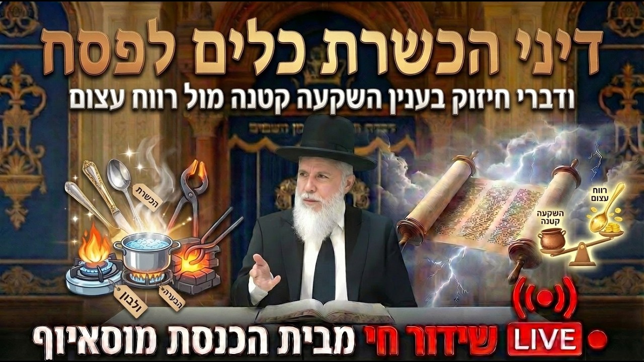 השיעור עוסק בבירור יסודות *הכשרת הכלים לפסח* על פי התורה, חז"ל והפוסקים. בתחילה מוסבר החידוש שהתורה לימדה במלחמת מדין, שגם טעם איסור הבלוע בדפנות הכלים נאסר, ולכן כאשר מבשלים בכלי שבלע איסור, הטעם נפלט למאכל. וכאן בא הכלל המרכזי בהכשרת כלים, "כבולעו כך פולטו": כלי שבלע באמצעות נוזלים מוכשר בהגעלה במים רותחים, וכלי שבלע על ידי אש ישירה טעון ליבון באש. כלים ששימשו בצונן בלבד די בשטיפה טובה. בנוסף מתבארים דיני טבילת כלים, שמטרתם להכניס כלי שהיה בבעלות גוי לקדושת ישראל, וכן נידונות שאלות מצויות לגבי כלי זכוכית, כלים למסחר וכלים חד פעמיים. בהמשך מובאים פרטים מעשיים בהכשרת כלים לפסח, כגון הצורך לנקות היטב את הכלי לפני הגעלה, ההבדל בין הגעלה לליבון, והמחלוקת בין השולחן ערוך והרמ"א לגבי כלי זכוכית והשלכותיה על מנהגי ספרדים ואשכנזים. כמו כן נסקרים דינים מעשיים להכשרת כלי המטבח בבית, כגון סירים, מחבתות, כיריים, פלטה, תנור ושולחנות, תוך הדגשת העקרונות כיצד להכשיר כל כלי לפי אופן השימוש בו במהלך השנה. לצד העיון ההלכתי משולבים דברי חיזוק בעבודת ה'. מתוך פירוש הפסוק "אדם כי יקריב מכם" מודגש שעיקר הקרבן הוא הקרבה עצמית והתמסרות לעבודת ה'. מובאים דברי חז"ל שהקב"ה נותן חכמה למי שמשקיע ומתאמץ בתורה, ומודגש שכאשר אדם מוסר מעצמו ומנצל את זמנו ללימוד ולעבודת ה', הוא זוכה לסייעתא דשמיא ולהתקדמות גדולה. השיעור מסתיים בקריאה לנצל את הזמן לעבודת ה' וללימוד תורה מתוך תקווה לגאולה שלמה במהרה. #הרבזמירכהןערוץהרשמי #הרבזמירכהן #foryou
