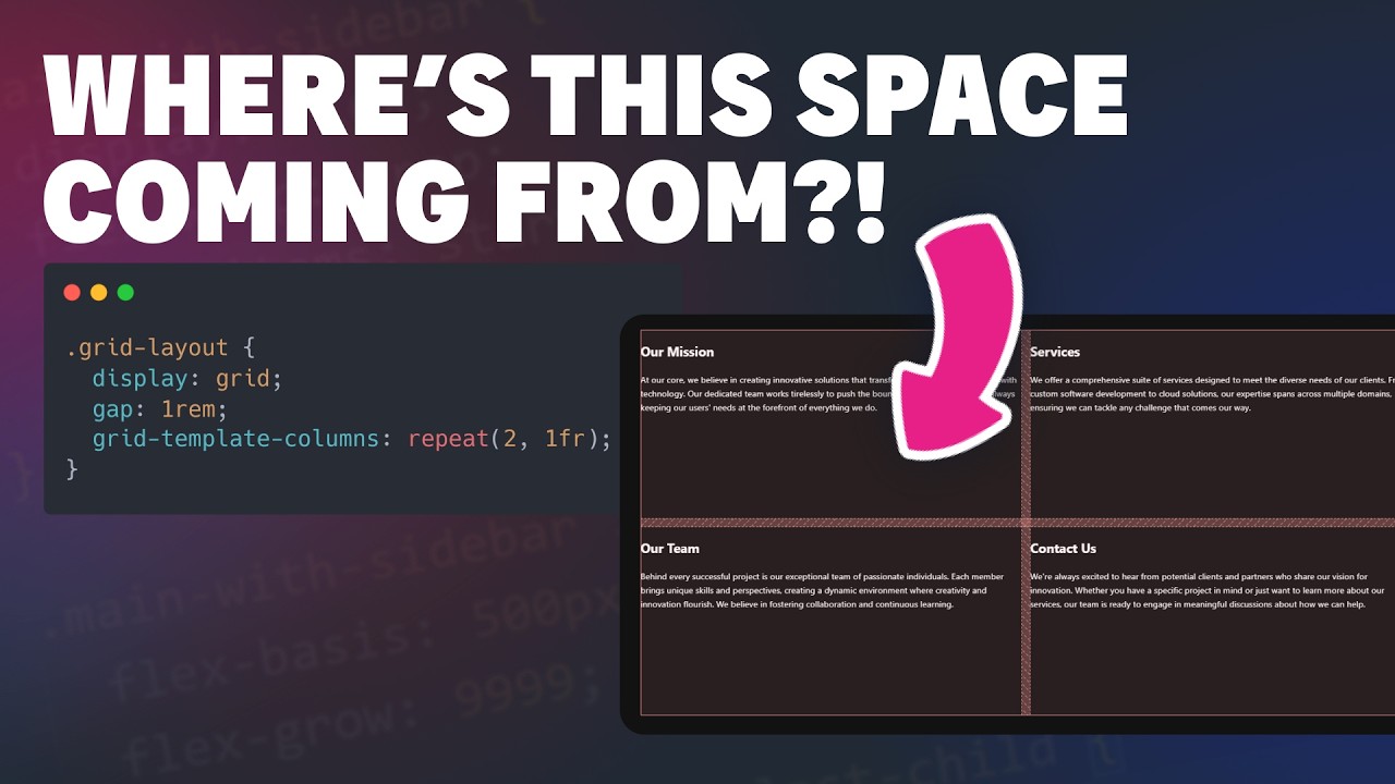 Ever use grid, only for your rows to be way too tall, and you can't figure out why? It's happened to all of us, but luckily it's easy to fix! š Links ā Codepen from this video: https://codepen.io/kevinpowell/pen/zxOJQOV ā Join my Discord community: https://kevinpowell.co/discord ā In-depth on Grid alignmen: https://youtu.be/WvoYYok1Ddo ā In-depth on Flexbox alignment: https://youtu.be/uIzaU98Ak1k Get a YT membership: Join this channel to get access to perks: https://www.youtube.com/channel/UCJZv4d5rbIKd4QHMPkcABCw/join ā Timestamps 00:00 - Introduction 00:30 - Why this happens 01:24 - How to fix it #css -- Come hang out with other dev's in my Discord Community š¬ https://discord.gg/nTYCvrK Keep up to date with everything I'm up to ā https://www.kevinpowell.co/newsletter Come hang out with me live every Monday on Twitch! šŗ https://www.twitch.tv/kevinpowellcss --- Help support my channel šØāš Get a course: https://www.kevinpowell.co/courses š Buy a shirt: https://teespring.com/stores/making-the-internet-awesome š½ļø Join as a channel member: https://youtube.com/@KevinPowell/join š Support me on Patreon: https://www.patreon.com/kevinpowell or through YT memberships: Join this channel to get access to perks: https://www.youtube.com/channel/UCJZv4d5rbIKd4QHMPkcABCw/join --- My editor: VS Code - https://code.visualstudio.com/ --- I'm on some other places on the internet too! If you'd like a behind the scenes and previews of what's coming up on my YouTube channel, make sure to follow me on Instagram and Twitter. Bluesky: https://bsky.app/profile/kevinpowell.co Codepen: https://codepen.io/kevinpowell/ Github: https://github.com/kevin-powell --- And whatever you do, don't forget to keep on making your corner of the internet just a little bit more awesome!
