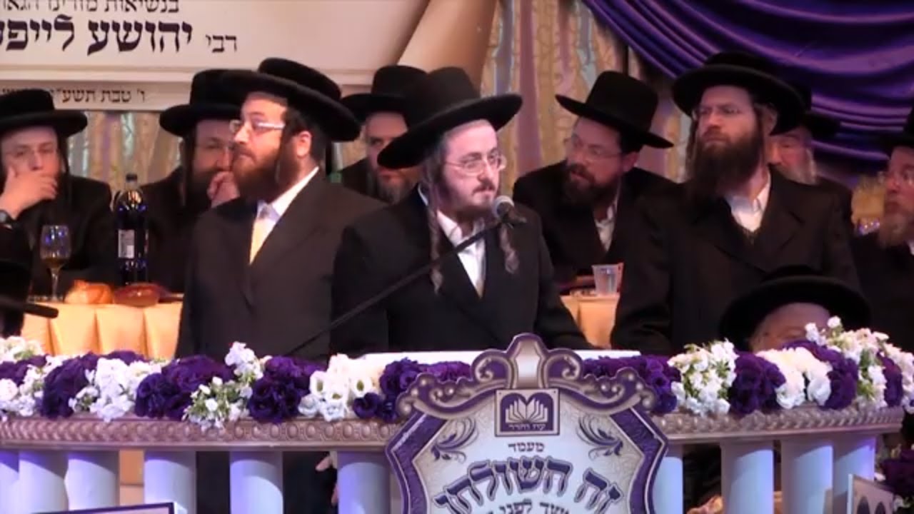 מורינו הגאון הרב מנחם מנדל פומרנץ שליט"א נושא דברים במעמד זה השולחן בהשתתפות מרנן ורבנן גדולי ישראל שליט"א