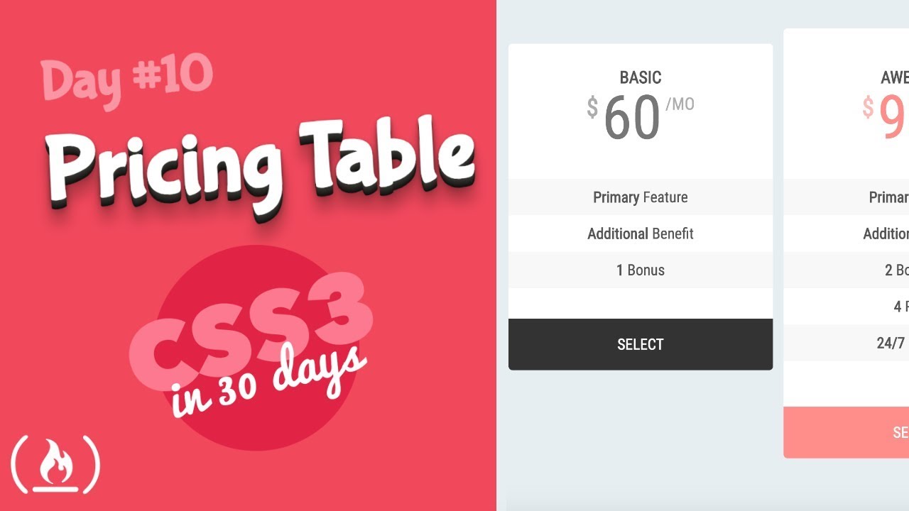 ⭐️Files you need ⭐️ 💻Pricing Table Code: https://www.dropbox.com/sh/884c73ionx2c7mn/AAA0WuGx_gh_ohsk6ftPIzXva?dl=0 💻All tutorials in this series need this "_theme-styles" directory (only download once): https://www.dropbox.com/sh/890hx6ke34oovaz/AAByJ-jb-H5pWuIUx7t_GvQqa?dl=0 This video works as a stand-alone tutorial but is also day 10 of CSS3 in 30 Days. For the rest of the series, check out this playlist: https://www.youtube.com/playlist?list=PLWKjhJtqVAbl1AfjiGyYxwpdAPi5v-1OU CSS3 in 30 Days is developed by Brad Hussey. Check out his website for more great tutorials: https://codecollege.ca/ -- Learn to code for free and get a developer job: https://www.freecodecamp.org Read hundreds of articles on programming: https://medium.freecodecamp.org ❤️ Support for this channel comes from our friends at Scrimba – the coding platform that's reinvented interactive learning: https://scrimba.com/freecodecamp