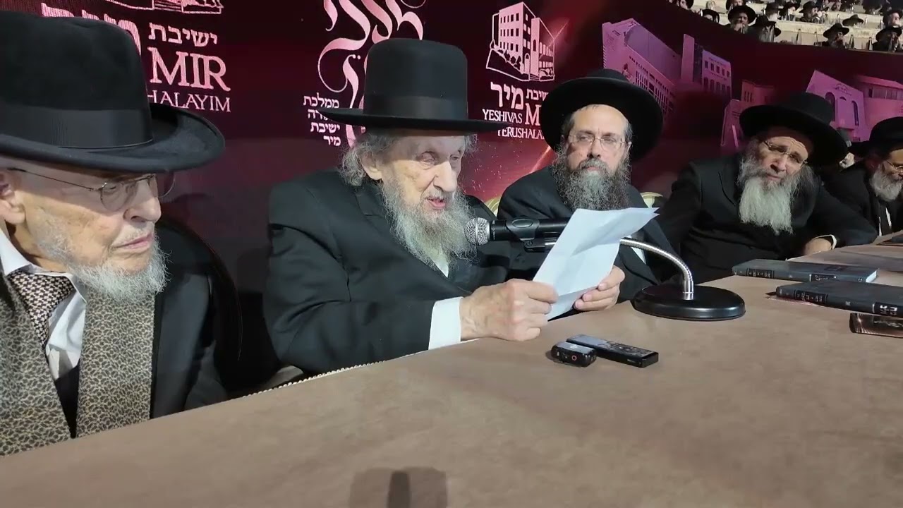 רבבת תלמידים ובוגרי ישיבת מיר התכנסו אמש באולמי ארנה לכנס מיוחד "מלכי רבנן" במעמד גדולי ישראל בראשם מנהיג הדור מרן הגר"ד לנדו שליט"א, בדבריו אף התייחס לגזירת הגיוס המרחפת, במרכז המעמד האזינו גדולי ישראל והקהל האדיר בחרדת קודש למשא מנהיג הדור מרן שליט"א שנשא שיחה מרוממת על מעלת עולם הכוללים ועל האחריות הרובצת על כלל ישראל לקיימו ולחזקו: קרדיט תיעוד: דניאל נפוסי, להלן הדברים המלאים: ברשות מרנן ורבנן שליט"א, ברשות ראש הישיבה שליט"א וברשות ראשי ורבני הישיבה שליט"א במסכת אבות שנינו, רבי שמעון אומר, שלשה כתרים הם, כתר תורה, כתר כהונה, כתר מלכות. ובאבות דרב נתן, כתר כהונה כיצד, אפילו נותן כסף וזהב שבעולם אין נותנין לו. כתר מלכות, אפילו נותן כל כסף וזהב שבעולם אין נותנין לו. אבל כתר תורה אינו כן, עמלה של תורה, כל הרוצה ליטול יבא ויטול. ועוד כתוב שם. אהרן לא זכה לכהונה אלא בזכות התורה, שנאמר כי שפתי כהן ישמרו דעת ותורה יבקשו מפיהו. דוד לא זכה למלכות אלא בזכות התורה, שנאמר זאת היתה לי כי פקודיך נצרתי. בדור האחרון, מי שזוכה להתעטר בכתרה של תורה, הם אברכי הכוללים, הם אלו שזוכים לממשלת התורה, אברכי הכוללים הם נזר הבריאה, הם אלו שאין להם בעולמם אלא תורה ולימודה עיונה ועמלה, עליהם נאמר כל המקבל על עצמו עול תורה מעבירין ממנו עול דרך ארץ. עולם הכוללים בזמננו, הוא דבר ששנים רבות לא היה, אברכי הכוללים זוכים לאור התורה באופן נפלא ונשגב, רבים מהם, ואני מכיר באופן אישי, הם ענקי תורה, חלקם במושגים שגם בדורות קודמים היו לשם ולתהלה. בעולמם של אברכי הכוללים מגיעים לדרגות נעלות בידיעת התורה, בהבנתה, בהיקפה של תורה, ובעומק שמועות הש"ס, ואפילו החמורות והקשות שבהם. ויחד עם זה באופן בלתי נפרד, אינו דומה ביתו של אברך כולל, לביתו של מי שלא זכה לזה, האושר שקיים בבתיהם של אברכי הכוללים, החינוך הטהור והזך שזוכים ילדי האברכים, אין דומה לזה. המידות הטובות והנעלות, שמי שאין לו בעולמו אלא תורה ואמיתה של תורה, זוכה להם בקנין נפשו מכוח עמל התורה, הם מידות שמשפיעות על כל סביבתו. גם כאשר יש קשיים כאלו ואחרים, ויש קשיים לכל אדם באשר הוא, ההתמודדות של משפחות האברכים, היא התמודדות נעלה ונשגבה, שמגביהה לדרגות גבוהות ורוחניות יותר ויותר, כל מי שחינוכו העצמי וחינוך בני ביתו, הוא חינוך של חיי תורה, כל חפציך לא ישוו בה. אין דוגמה בעולם לאושר הגדול שלו, של אברך כולל שאין לו בעולמו אלא תורה, ואין דוגמה בעולם לחיי האושר של בני ביתו. אין קצבה לריבוי תורה, ואין גבול לחובה ולזכות - להוסיף עוד בני ישיבות ועוד אברכי כוללים, לומדי התורה הם עטרת תפארת ישראל, ואברכי הכוללים הם היסודות, הם המחיצות, והם הבנין של כלל ישראל. לדאבוננו, יש כאלו שלא מבינים את זה, ויש כאלו שזוממים לקעקע את עולם התורה, וחפצים לגייס לומדי תורה חלילה, וכולנו עומדים נגדם כחומה בצורה שאפילו בן ישיבה או אברך אחד לא יגוייסו לצבא. אבל, ברוך השם, זכה דורנו, שישנם נדיבי לב בחוץ לארץ, אשר יקרת סגולת התורה חקוקה בנפשם, חלק מהם זכיתי להכיר באופן אישי, ואני מתפעם מעוצם מסירות ליבם ונפשם למען החזקת תורה, יש מהם שאפשר לבקש מהם ברכות, והם עושים ומעשים, דברים נפלאים וכמעט בלתי אפשריים למען החזקת הכוללים בארץ ישראל ובשאר מקומות, אשרי העם שככה לו. ויחד עמם, ראשי הישיבות והכוללים, אשר לוקחים על עצמם עול עצום להחזיק את הישיבות והכוללים דבר חודש בחדשו, ועיסוק זה במלאכת החזקת הישיבות והכוללים, הוא עיסוק שלעולם אינו יכול להסתיים ולעולם אין בו די, וזהו חובתכם להכיר טובה לידידי ראש הישיבה הגאון ר' אליעזר יהודה פינקל שליט"א שפועל בצורה מופלאה ומוסיף עוד כהנה וכהנה להרבות תורה ולקיים עולם, בהחזקת תלמידי ואברכי הישיבה בכבוד כראוי לכבודם של אלו שהם נזר הבריאה. יהי רצון שחפץ השם בידו יצלח, להוסיף עוד ועוד, בסיעתא דשמיא, ויזכה לכל מילי דמיטב. ואתם האברכים היקרים ובני משפחותיכם, יעזור השם, שתזכו להשכיל ולהבין את המעל