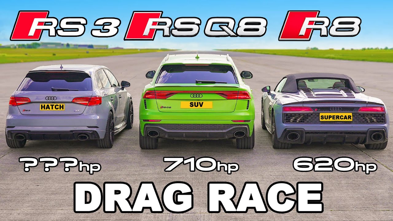Want to know how to sell your car? 83% of customers get a higher price with carwow - it’s also free and easy! Check us out here: https://bit.ly/Buy-Sell-WOW ............................................................. Check out the RSQ8: https://www.instagram.com/f1__german/ Check out the RS3: https://www.instagram.com/m140_br/ What will happen when you race an Audi R8 against an Audi RS3 and an Audi RSQ8? You think it would be a walkover for the R8, right? Well, don’t be so sure! You see, we’ve brought in a tuned RS3 & RSQ8 and we’re about to see if the extra work on their engines is enough to bring down an R8! So let’s see how they all compare. Starting with the RS3, it’s still packing the usual 2.5-litre 5-cylinder turbo petrol, however, following a tune, it’s now able to produce 550hp and 730Nm of torque! As for the RSQ8, it’s equipped with a 4-litre twin-turbo V8 that can now put down 710hp! We’re not sure what the torque figure is, but we estimate it to be 900Nm. So do these two cars have what it takes to bring down the R8 V10 Performance Spyder? After all, its 5.2-litre naturally-aspirated V10 is an absolute weapon, that has no problem producing 620hp and 580Nm! All we know is, there’s only one way to find out… LET’S RACE! Mega SUV drag race: https://bit.ly/Mega-SUV-Drag-Race-2408 Mat's Audi deal: https://bit.ly/Mats-Audi-Deal-2408 ............................................................. Instagram – http://www.instagram.com/carwow Tiktok - https://www.tiktok.com/@carwow Facebook – http://www.facebook.com/carwowuk Twitter – http://www.twitter.com/carwowuk Sign Up to our Newsletter – http://bit.ly/carwow-Newsletter Oder auch in Deutschland Geld beim Autokauf sparen – http://bit.ly/carwow-DE Visita nuestra página web para saber cuánto te puedes ahorrar en tu nuevo coche – http://bit.ly/carwow-ES