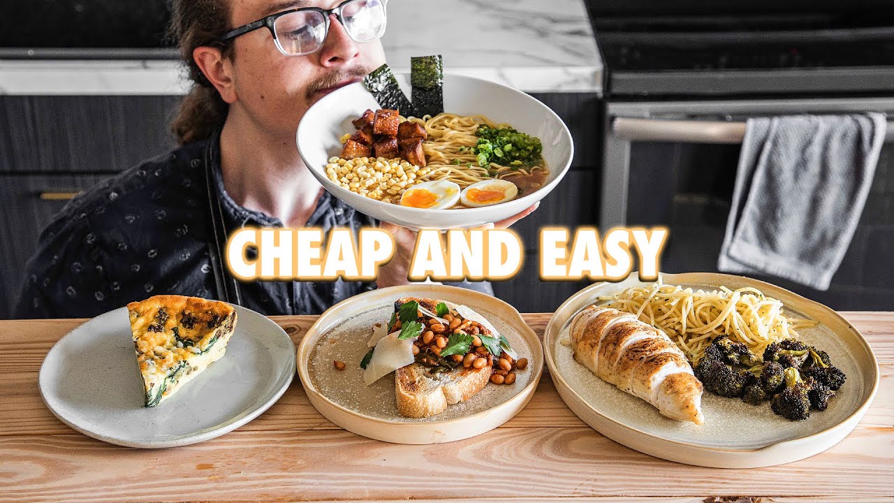 Cooking food at home doesn't always have to be expensive and time consuming. I mean granted, normally I think people are totally copping out when they complain about that buutttt that's besides the point. Here are some easy meals to make during the week on a budget. FOLLOW ME: Instagram: https://www.instagram.com/joshuaweissman Tik Tok: https://www.tiktok.com/@flakeysalt Twitter: https://twitter.com/therealweissman Facebook: https://www.facebook.com/thejoshuaweissman Subreddit: https://www.reddit.com/r/JoshuaWeissman/ --------------------------------------------------------------- Ingredients you'll need: Frittata: 1 dozen eggs ($4) 1/2 (120ml) cup milk (($1) Cooked vegetables of choice (about 1 cup total) ($4) 1 cup grated cheese(120g) (3/4 inside the rest of the 1/4 on top (2.75) 2 tablespoons (24g) butter $.50) Salt and pepper to taste Not English Beans On Toast: 12 oz chorizo (3 dollars) 3/4 teaspoon (2g) red pepper flakes .10 cents 4 cloves garlic toasted .20 cents 1/2 cup (120ml) water 2 cans white navy beans (2.50) 3 cups 75g baby spinach 2.00 17.6 oz (500g) Container crushed tomatoes 2.75 Bread (4.00) Pasta Aglio E Olio: 1lb spaghetti ($1.50) Salt to taste 1/4 cup plus 2 tablespoons olive oil ($3.00) 4 cloves garlic (.20 cents) 1/2 teaspoon (1g)crushed red pepper flakes (.10 cents) 1/4 cup (10g)finely chopped parsley ($1.00)