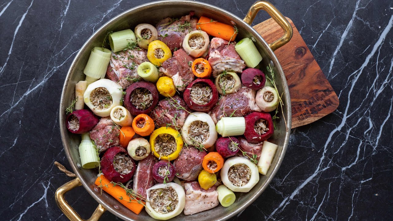 הכנתי עשרות סירים בחיי, אבל מתכון צבעוני, עשיר וחגיגי כמו זה לא הכנתי מעולם. סיר קוביות כתף טלה עם שורשים צבעוניים ממולאים באורז ובשר כבש, לא מהעולם הזה. היה לי עונג להכין את המתכון הזה. יש מתכונים לפעמים שאתה נקשר אליהם וזה אחד מהם. את המתכון הזה התחלתי בכתף טלה. ביקשתי משי הקצב של “הקצבים מירושלים״ שיפרק לי את הטלה מהעצם, יחתוך לקוביות גדולות ואת כל מה שהוא לא קוביות הוא טחן לי. הטחון זה הבשר שהכנסתי לתוך האורז. מצרכים: - 10-12 קוביות גדולות של כתף טלה מפורק (אפשר גם עם צוואר טלה) מתובלים בכף מלח גס וכפית פלפל שחור גרוס - 300 גרם בשר טחון כבש/טלה - כוס גדולה אורז בסמטי - 1 בצל קצוץ דק - 3 כפות שמן זית - 2 שיני שום כתושות - כפית מלח - חצי כפית קינמון - חצי כפית בהרט - חצי כפית פלפל שחור גרוס - 14 סלקים צבעוניים קטנים - 4-5 גזרים צבעוניים - 4-5 קולורבי - 2 כרישות - צרור טימין - מלח פלפל - 2 כוסות מיץ רימון 100 אחוז טבעי - כפית בהרט אופן ההכנה: - מתחילים עם השורשים. בעזרת מכשיר לריקון ממולאים מוציאים את התוכן. שומרים בצד את כל התוכן - במחבת גדולה מטגנים בצל וסלרי עד הזהבה של הבצל - מוסיפים את הבשר הטחון ומפוררים היטב. כאשר הבשר משנה את צבעו, מוסיפים את האורז ומתבלים ב2 שיני שום כתושות, כפית מלח, חצי כפית קינמון, חצי כפית בהרט ומסירים מהאש. - ממלאים כל שורש באורז. לא ממלאים עד הסוף, ממלאים קצת יותר מחצי, זה יעלה עד למעלה. - לוקחים סיר סוטאג רחב - שמים בקרקעית את כל מה שרוקנתם מהממולאים - שמים כרישה אחת פרוסה ו2 כפות שמן זית - מסדרים את בשר הטלה שתיבלנו במלח ופלפל גרוס - מסדרים את הממולאים - כדי לצופף את הסיר אנחנו שמים חתיכות כרישה גדולות עד שהוא מרגיש צפוף לגמרי ואין לאף ירק סיכוי ליפול - מפזרים טימין ועוד מעט מלח ופלפל - לוקחים קערה ושמים בה 2 כוסות מיץ רימונים ו2 כוסות מים, מוסיפים כפית ראס אל חנות וכפית מלח ומערבבים - יוצקים את הנוזלים אל הסיר. אם חסר מים תוסיפו. זה צריך לכסות את הממולאים. - מבשלים על אש גבוהה מכסה סגור עד רתיחה - אחכ משקים עם כף את הממולאים מכסים ומבשלים על אש קטנה מאוד כ 3 וחצי עד 4 שעות - שיהיה בתאבון וחג שמח פרסום בשיתוף @hakatzavim.jr #סלקיםממולאים#ממולאים #טלה #שוקטלה #יאבלולושמבלולו