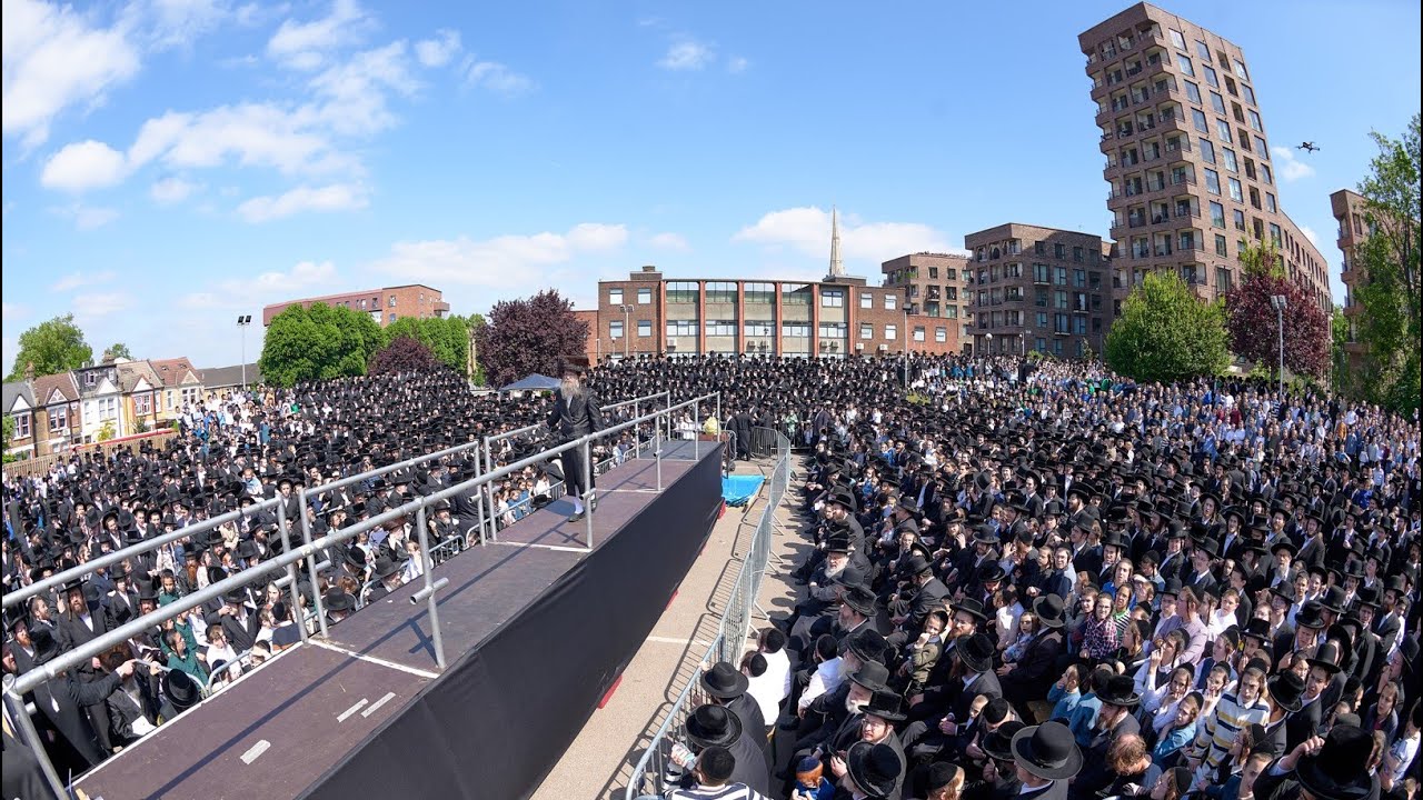 Thousands join the younger brother of Reb Meilech, Rav Shmuel Shmelke Biderman at a Lag Baomer Hadlukah at ‘Yesodei HaTorah.’ in Stamford Hill, London